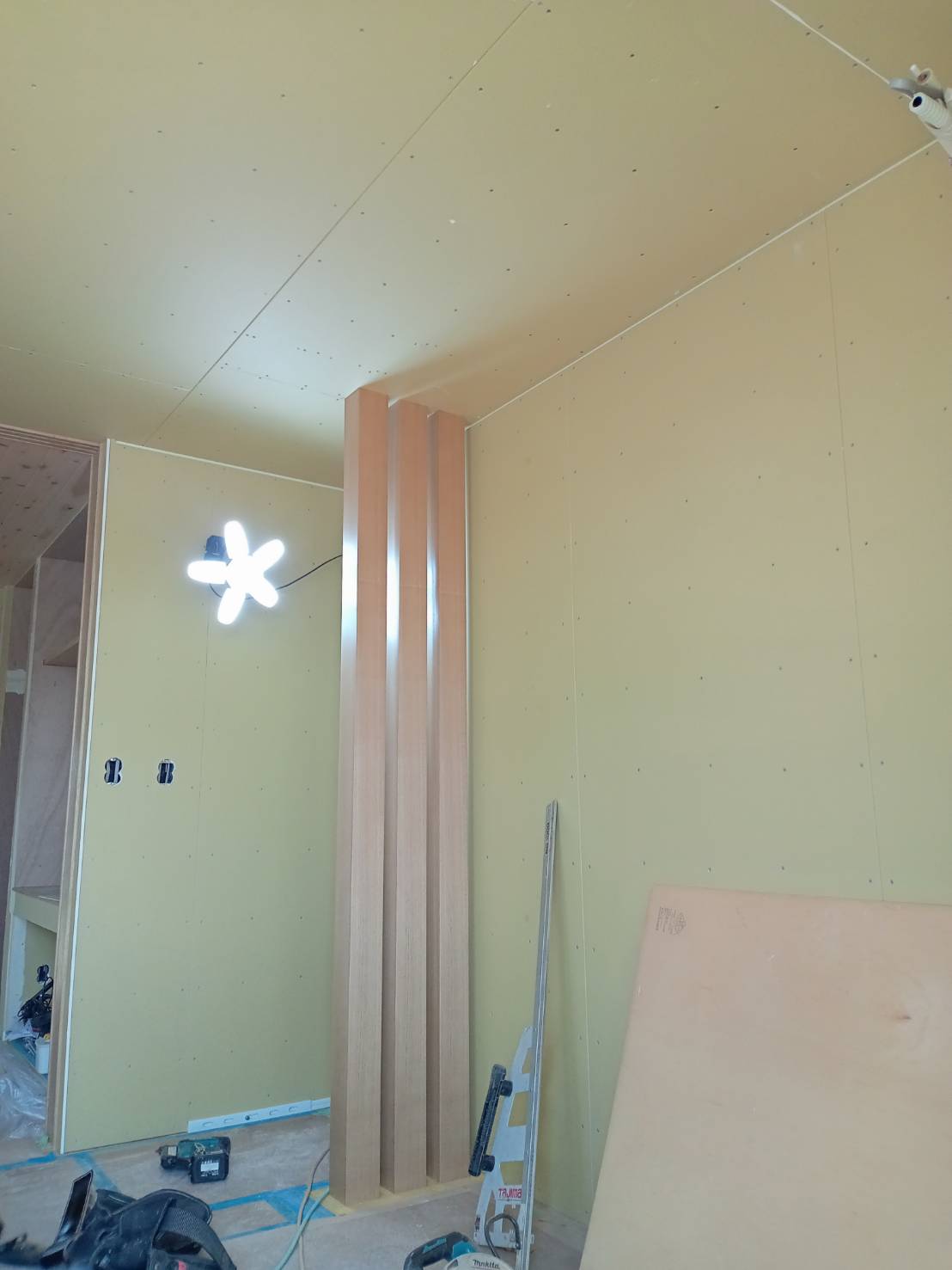 テレビボード横の化粧柱の取り付けも完了していました。キズがつかないようしっかりと養生されています。
