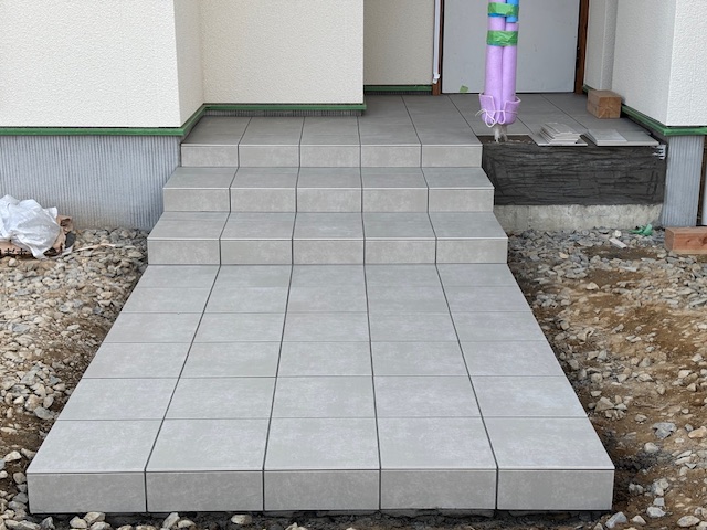 昨日玄関ポーチ廻りのタイル貼りが完了しました。 随分と印象が変わりました!