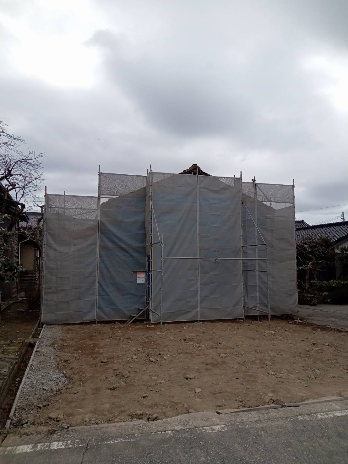 母屋の外部修繕工事が完了し、足場を解体いたしました。 これから新築工事の着工に向けて、仮設工事を進めてまいります。 引き続きよろしくお願いいたします。