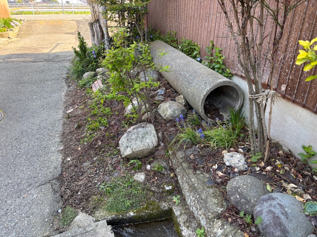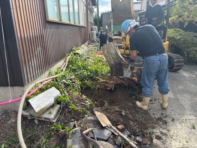 母屋の修繕工事が終わり、次は新築工事に向けてまずは給排水の工事へと移っていきます。画像部分の植栽や土を撤去し、配管の埋設工事を行っていきます。