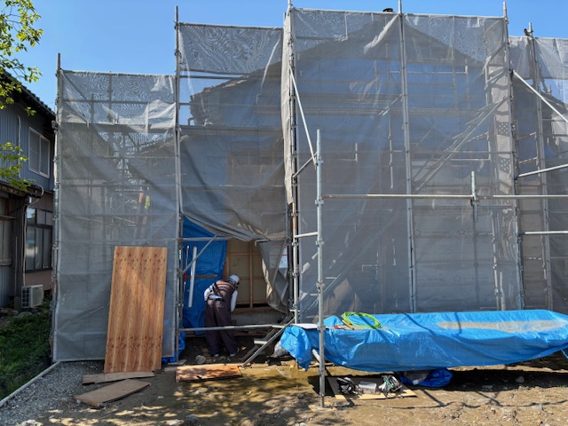 建物の解体後、棟続きだった母屋の外壁のつづくり工事に向けて、足場を設置いたしました。