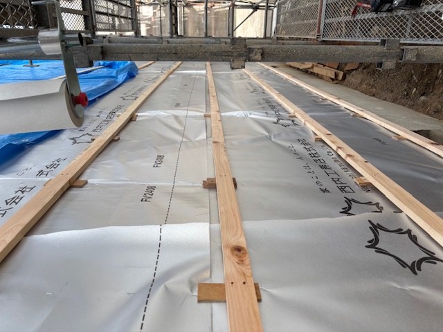 こちらは床の断熱材を敷設している様子です。事前にカットされた断熱材を所定の場所にはめ込んでいます。