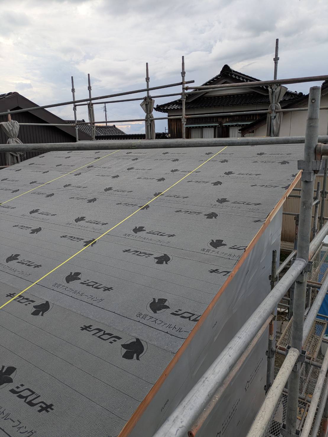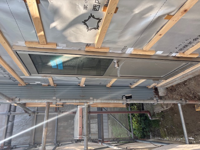 建て方当日に、屋根の防水紙(アスファルトルーフィング)の施工を完了しています。これから屋根工事を進めてまいります。