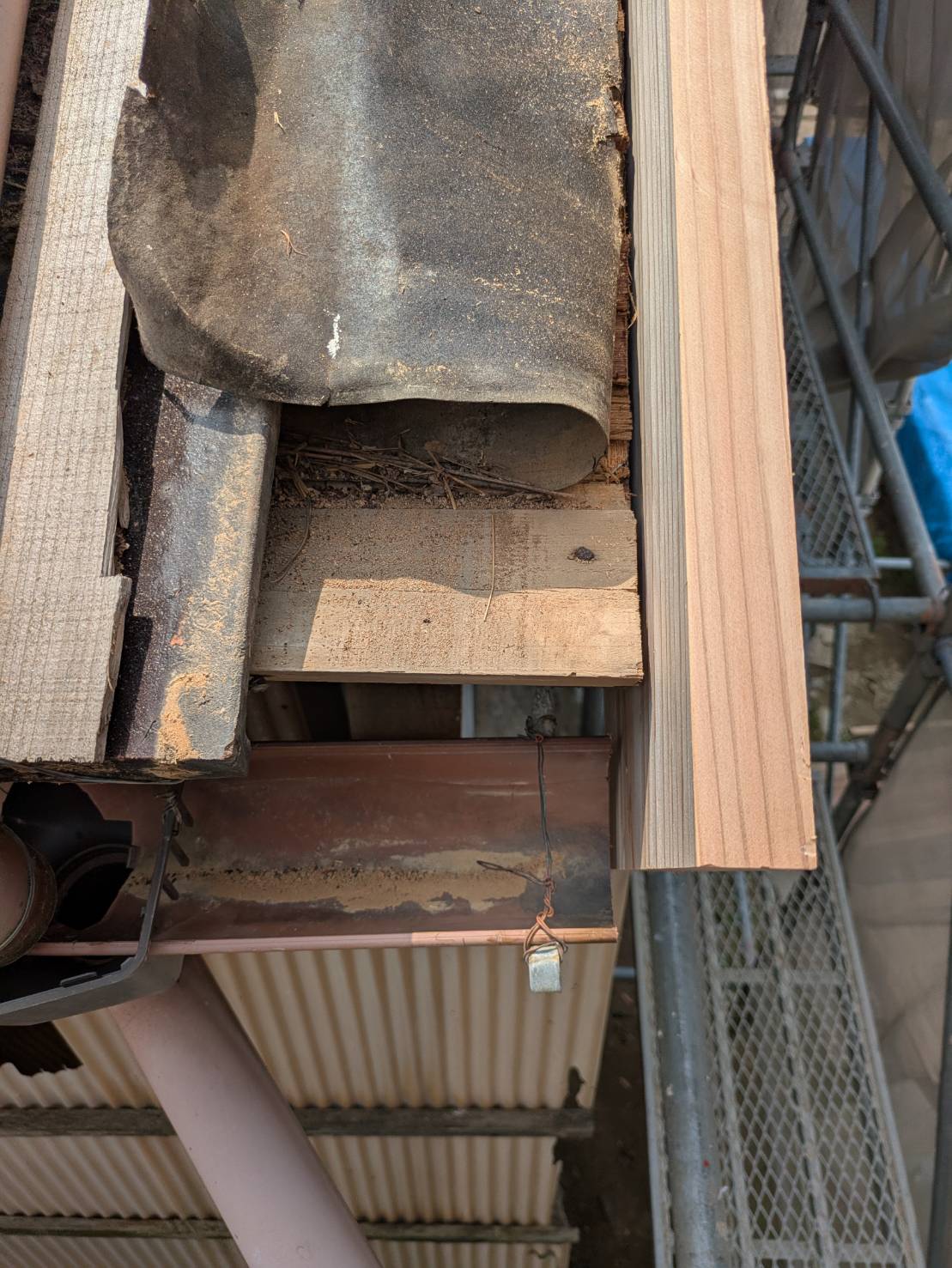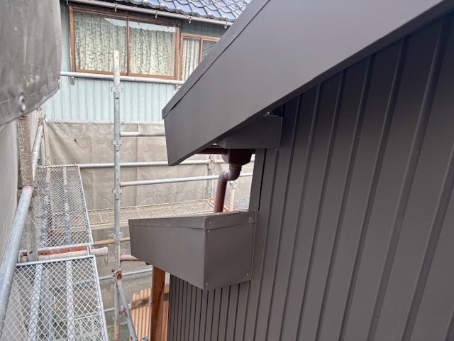 母屋屋根工事にあたって、見栄えがよくなるよう破風板を瓦よりも前に出すために、雨どいの長さを調整させていただき、施工しています。 雨どいは板金工事の際に、端部を再度調整します。