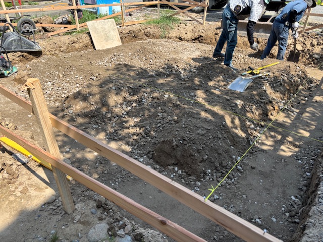 お盆休暇が明け、本日より基礎工事を行っております。多くの職人さんが手際よく作業を行っておられました。