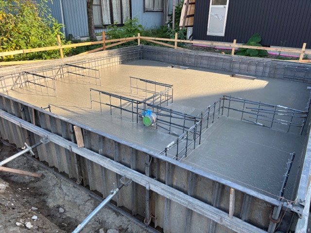 昨日検査機関による配筋検査に合格し、本日ベースコンクリートの打設を行いました。