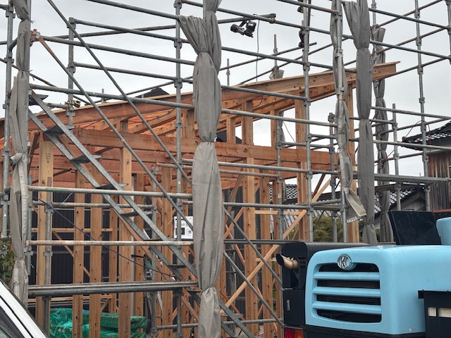 先日上棟を行いました。あいにく時折強い雨がありましたが、安全に作業を進め無事完了いたしました。これより、内部外部で多くの職人さんの手で工事が進められていきます。