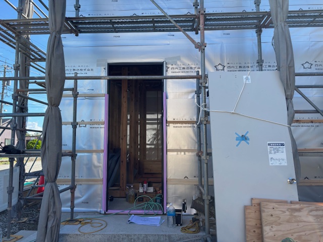 母屋外壁の下地工事が完了しています。来週月曜に出入り用の通用口ドアの設置を行います。