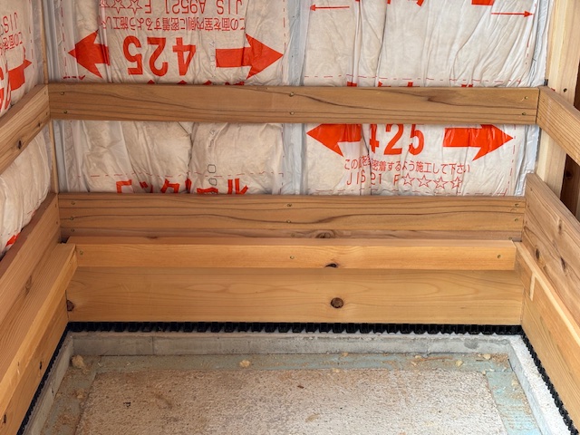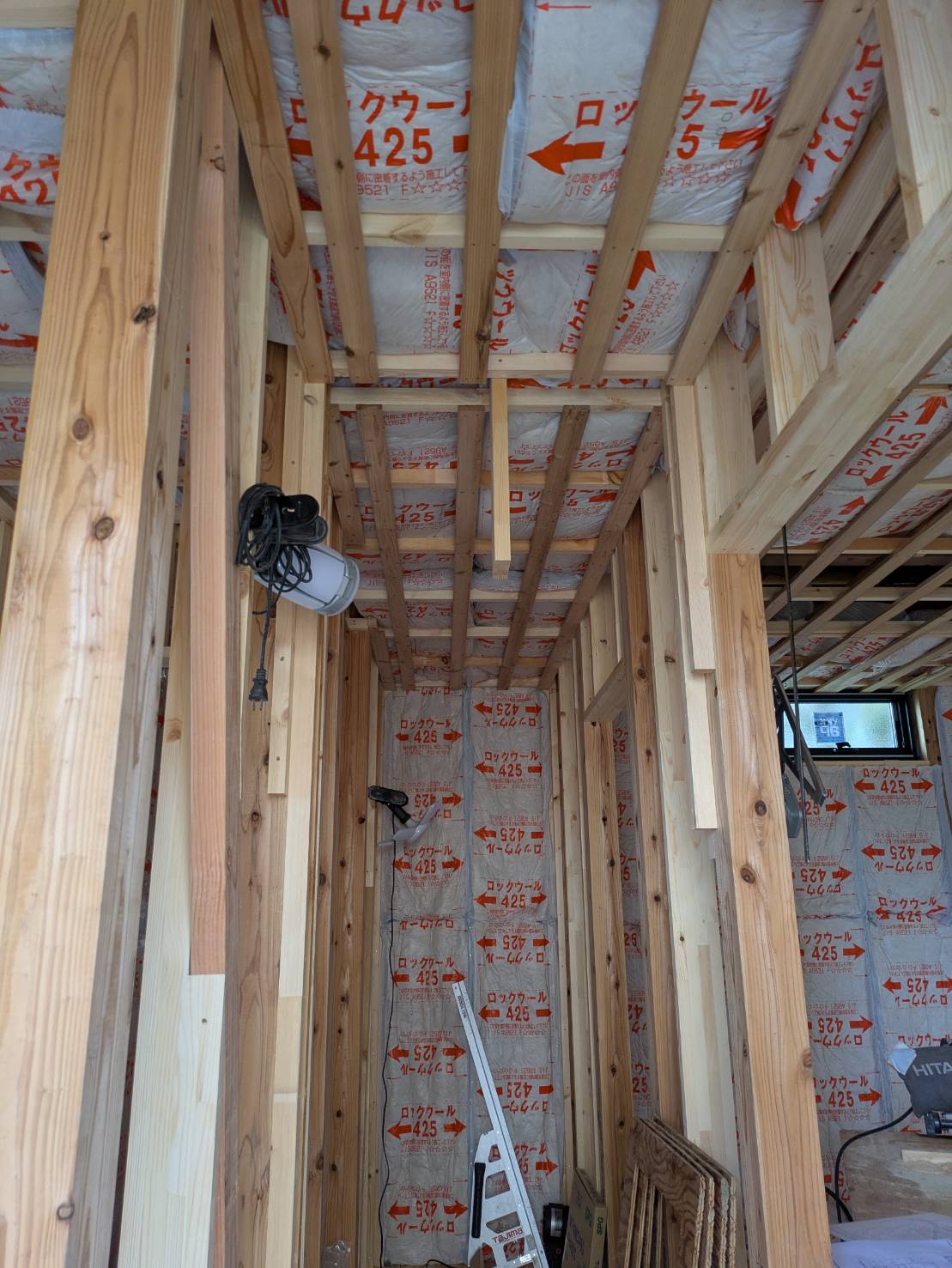 大工さんの工事が順調に進んでいます。室内の断熱材もしっかりと取り付けされていました。