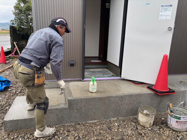 先日ご紹介した玄関廻りのモルタル工事が完了いたしました。タイル仕上げとは違ったスッキリとした仕上がりになっています。