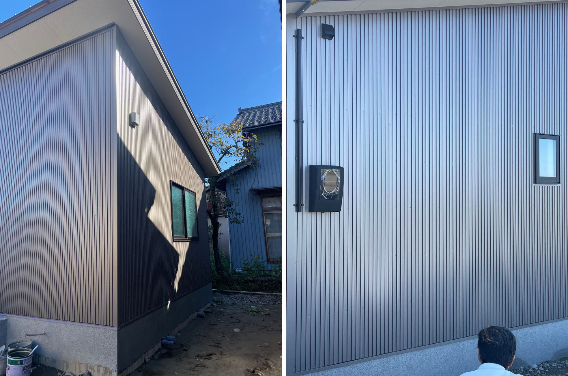 屋根工事が完了し、解体した納屋と、母屋の接続部分の修繕工事が完了しました。屋根については、雨漏れの心配が無いように、伏せ板を施工したあとに、鋼板でつつみ耐久性のある施工とさせていただいています。また、意匠についても、外装仕上げの色と統一感をもたせ、スタイリッシュな外観になるように施工しました。