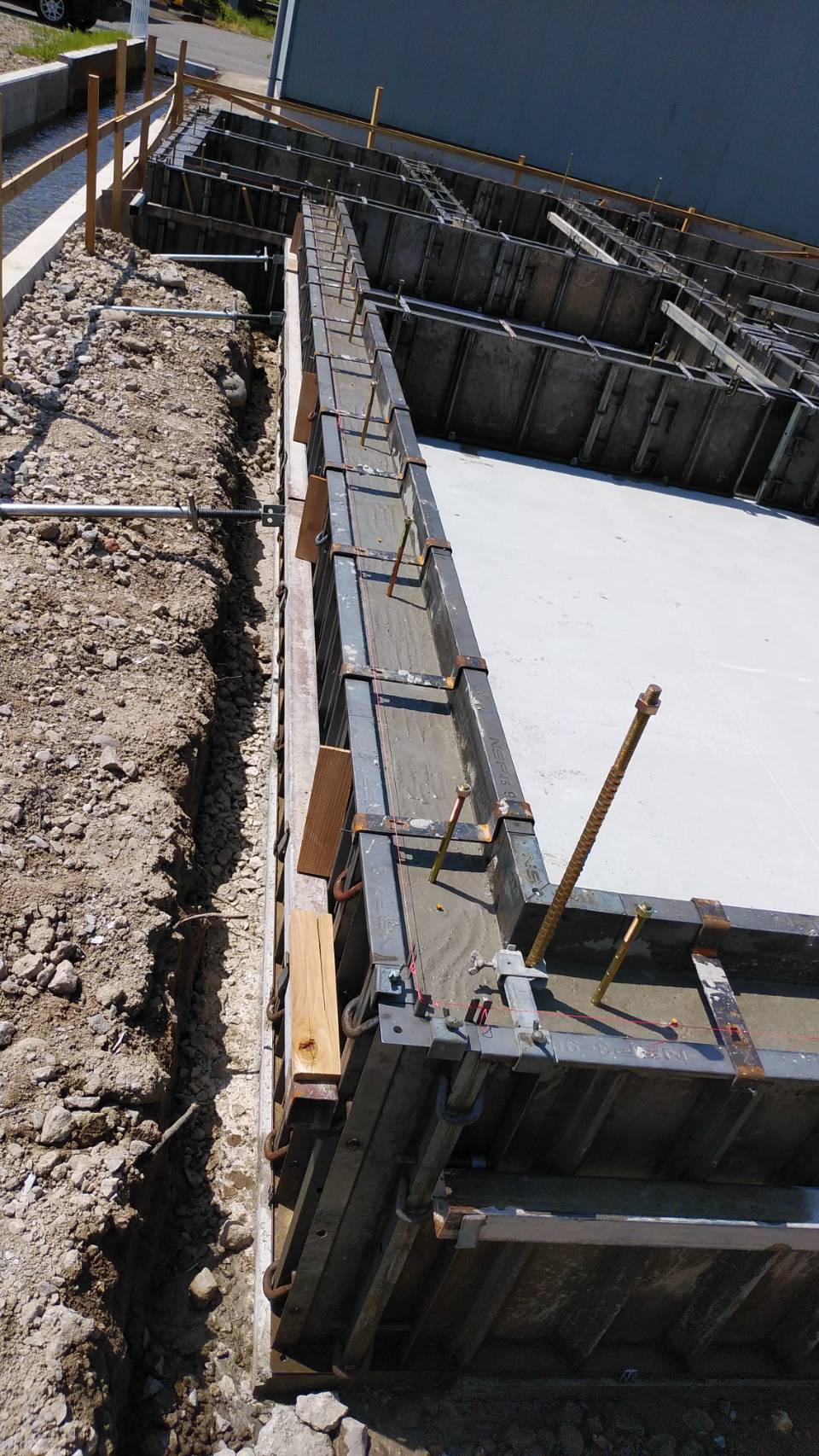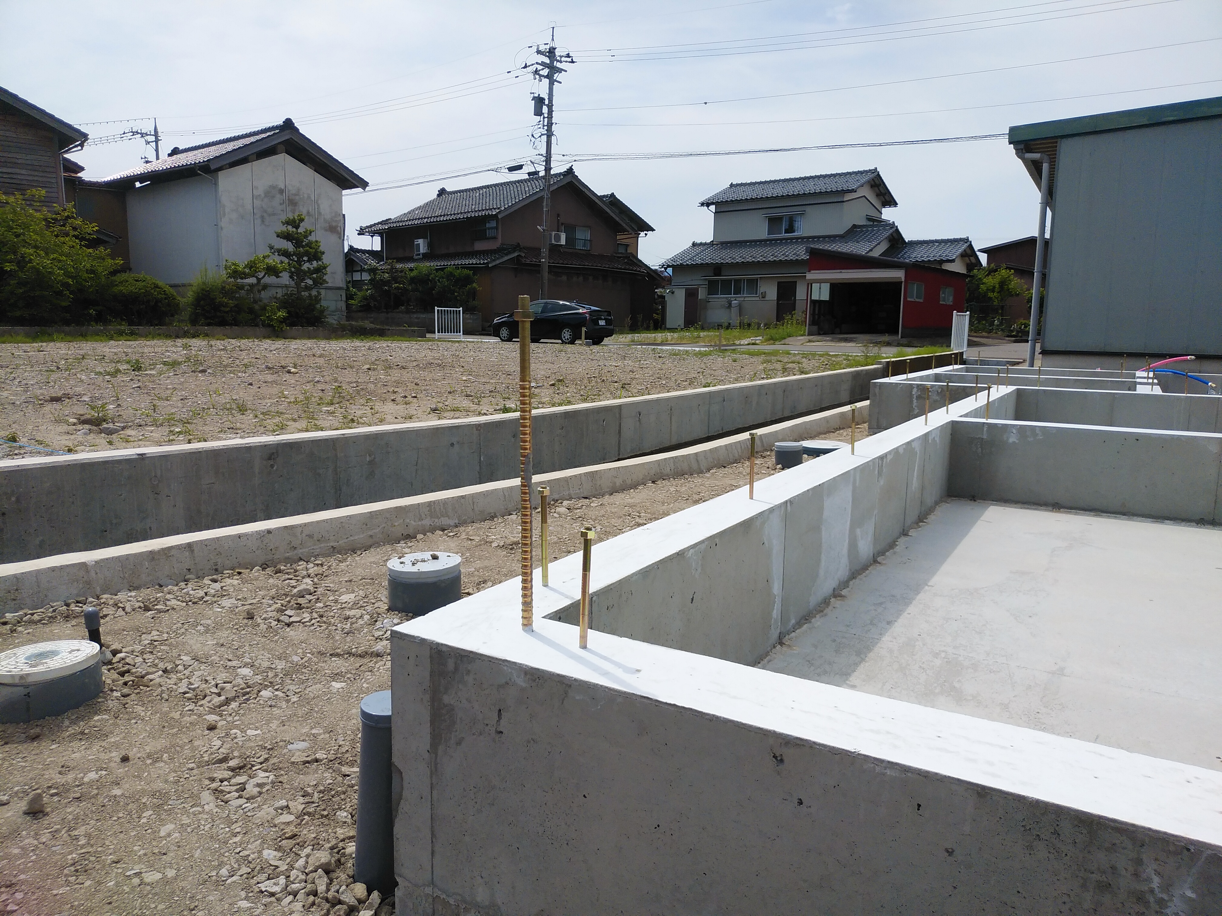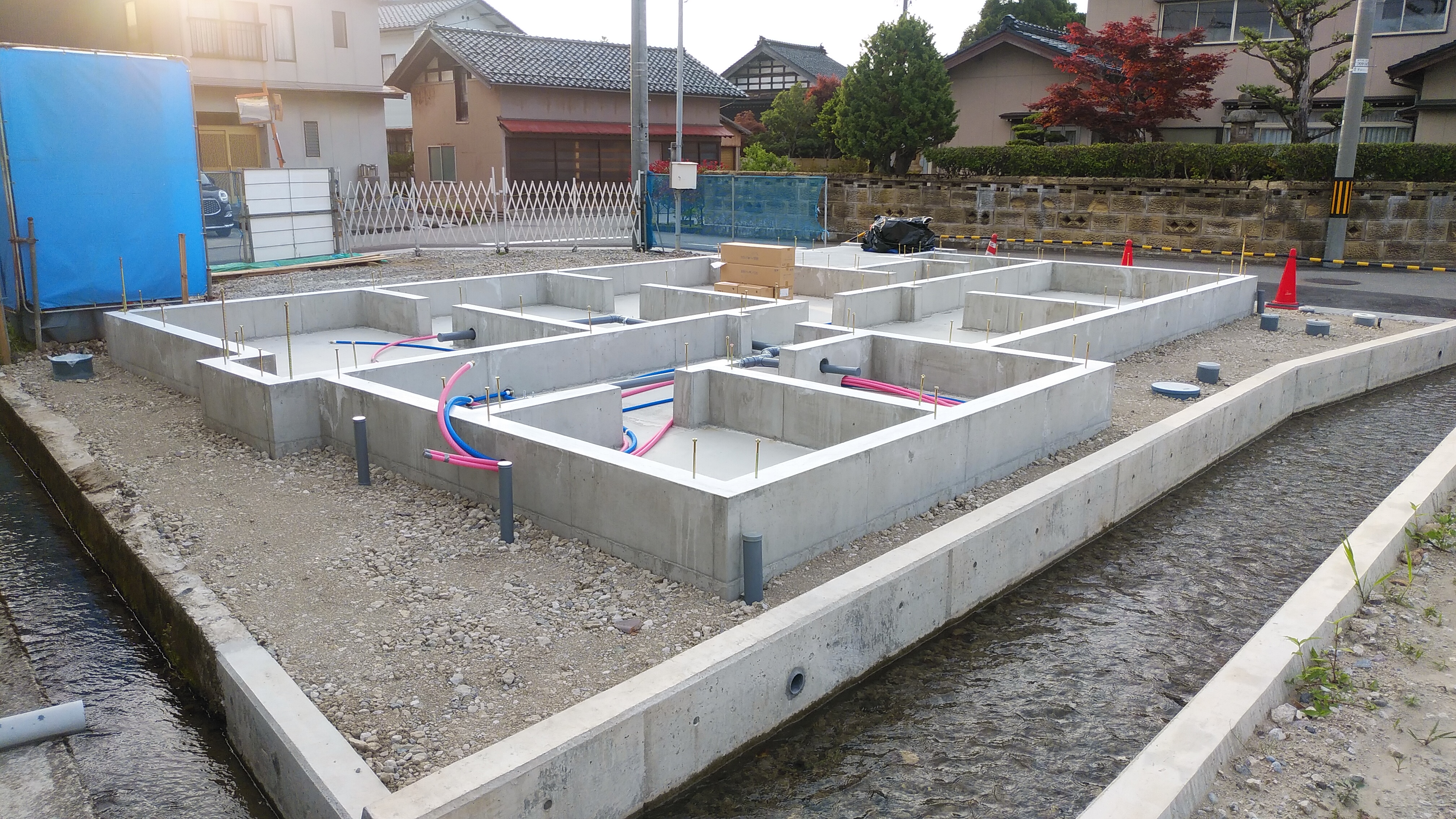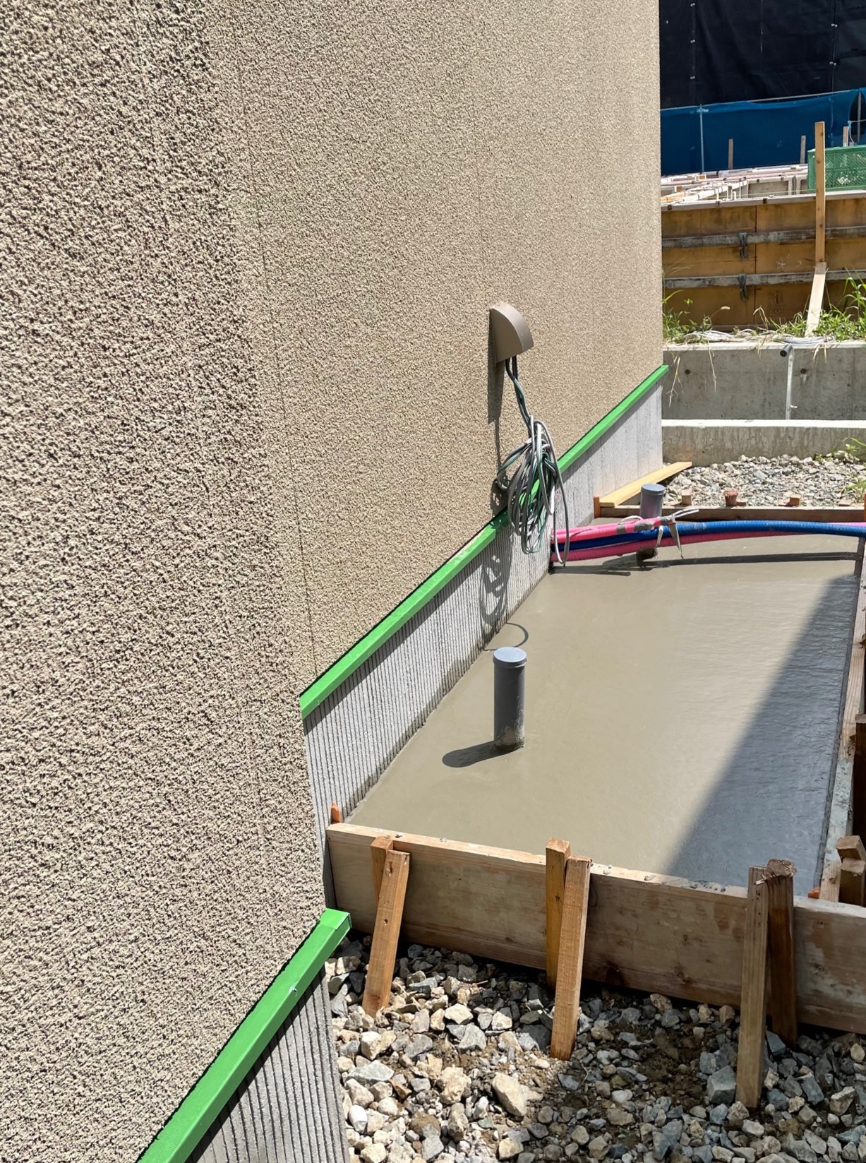 本日、基礎の立ち上がり部分にコンクリートを打設しました。打設した後は硬化するまでの間しばらく養生を行います。硬化後、型枠を外して外部の配管工事へと進んでいきます。(2022/05/24)