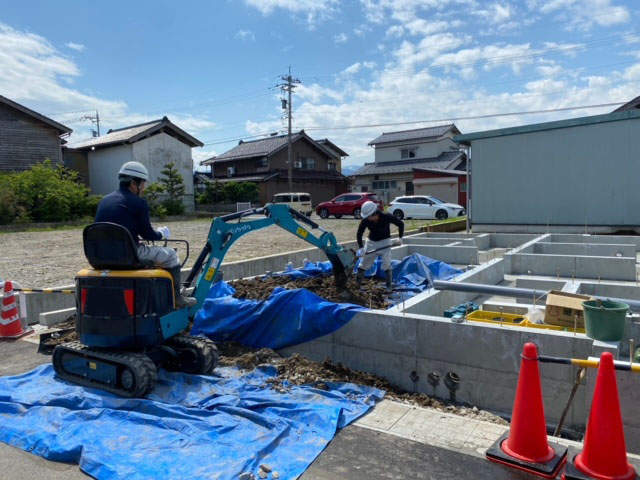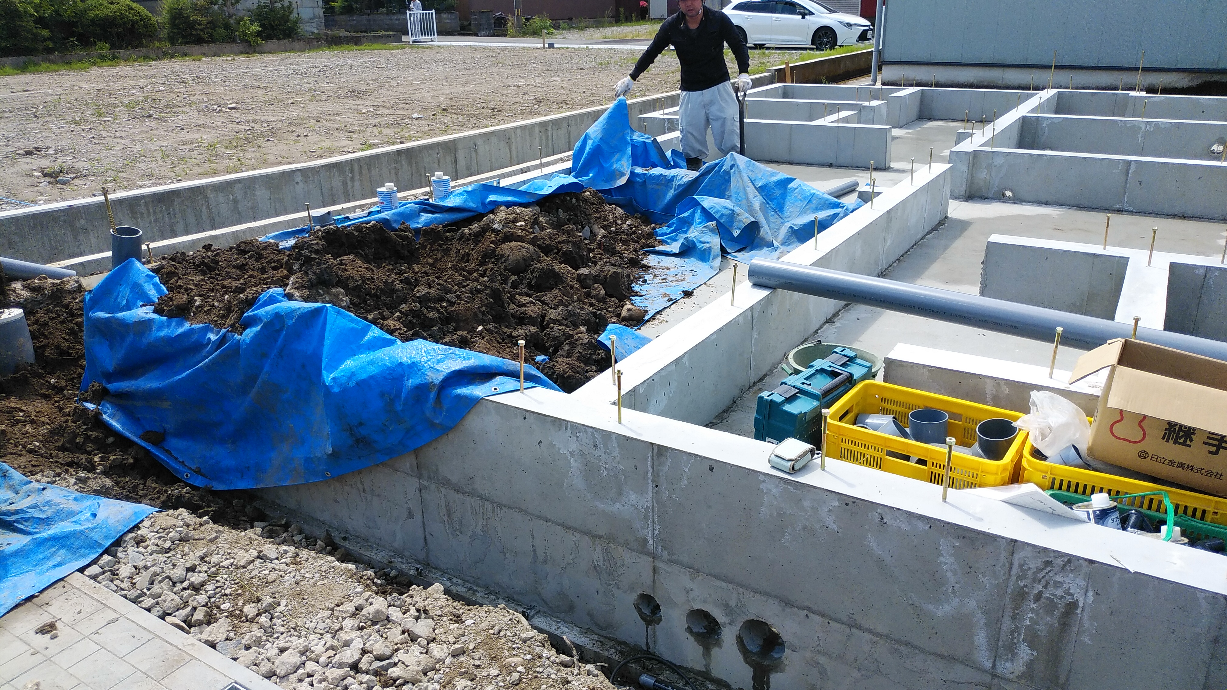 本日、外廻りの配管工事を行っております。 地面の中に排水管と給水管が施工され、掘り起こした土を戻していきます。 足場を建てる前に先に配管をしておくことで工事がスムーズに進められます。 配管工事が終わった後は土の埋戻しを行い、ポーチの下地を行います。