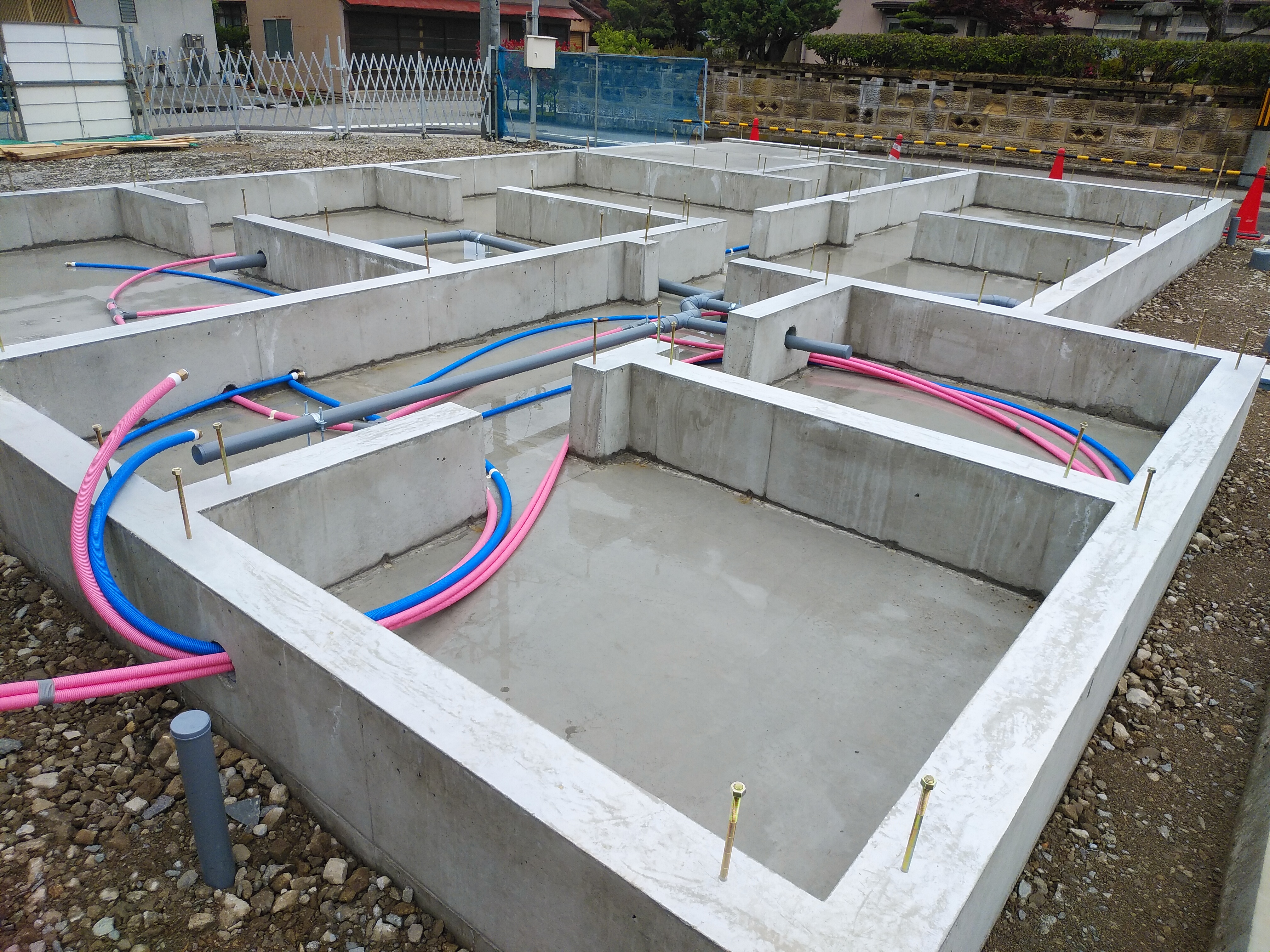 基礎部分は引き続き養生中となってりますが、基礎内部では様々な工事が進んでいます。ピンクのホースは給湯配管、ブルーのホースは給水配管になります。(まるで人間の体の動脈、静脈のようです) ちなみグレーの配管は使ったお湯、お水の排水管となります。