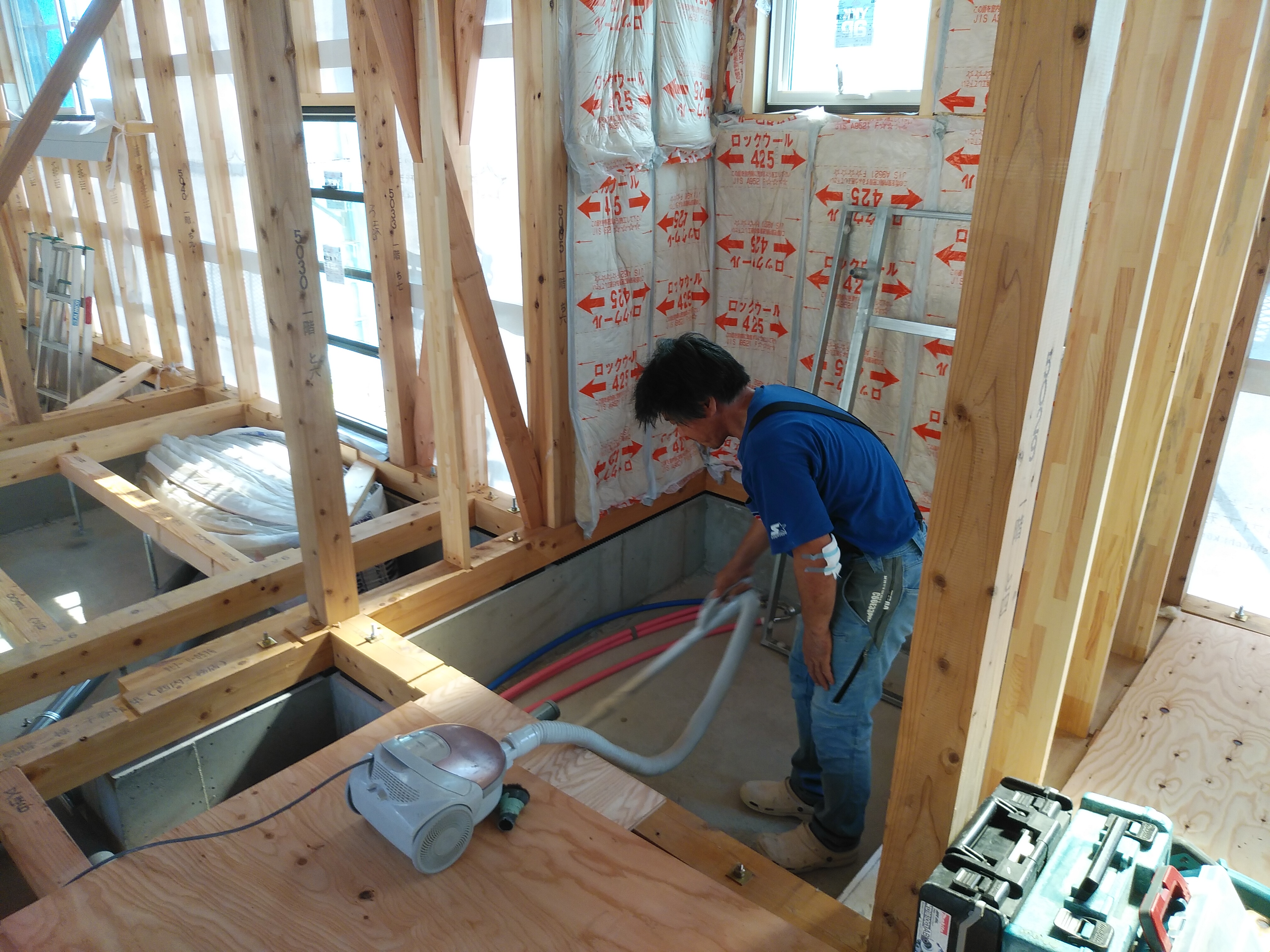 本日はユニットバスの施工日となります。 朝から専門の職人さんが据え付けの準備をなさっておられ、お風呂の下の細かなゴミも掃除機できれいに吸い取っていました。