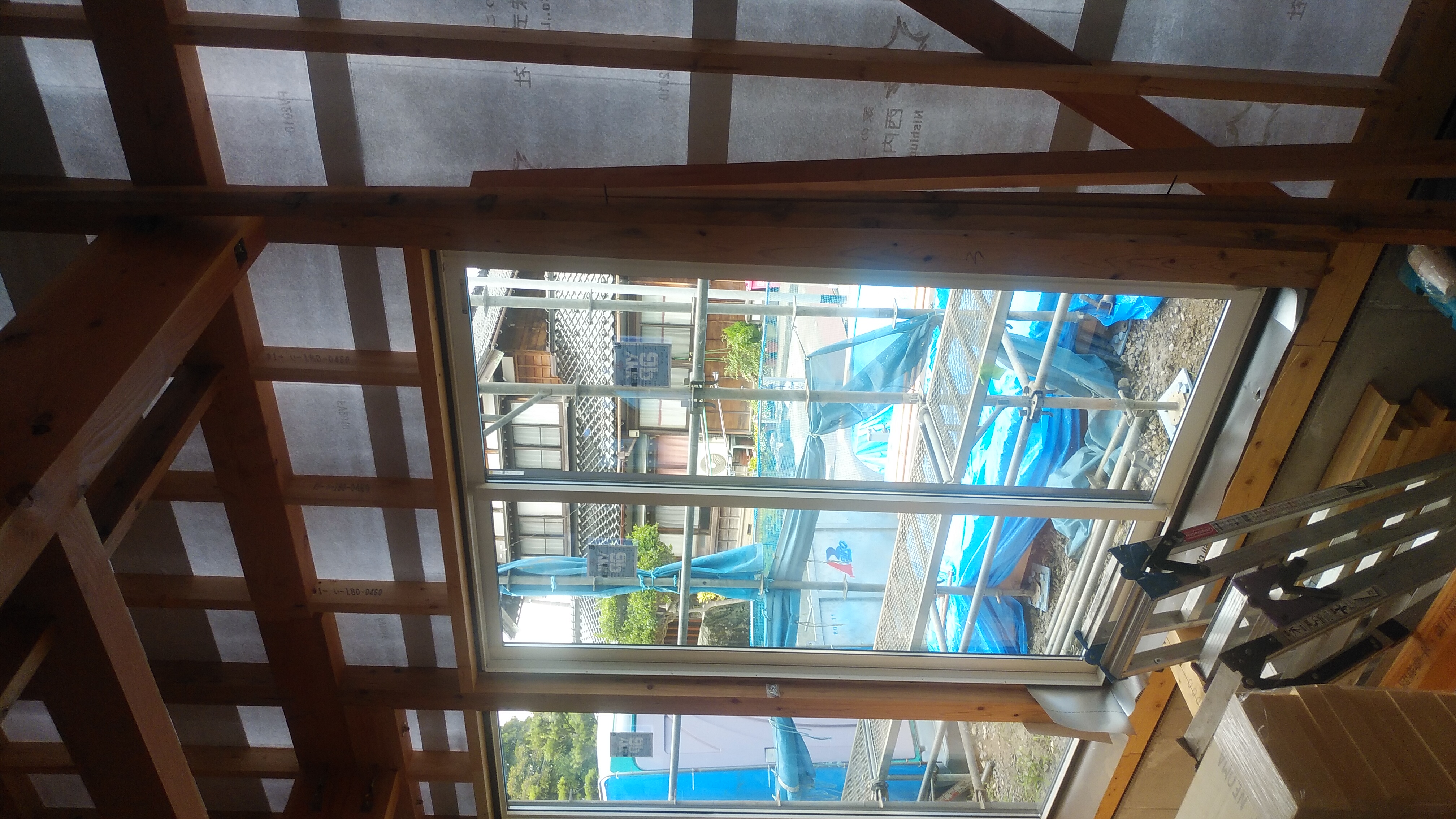 外廻りのサッシが取り付けられました。 床のほうは、防蟻工事後に垂木を固定、断熱材を入れで納めていきます。