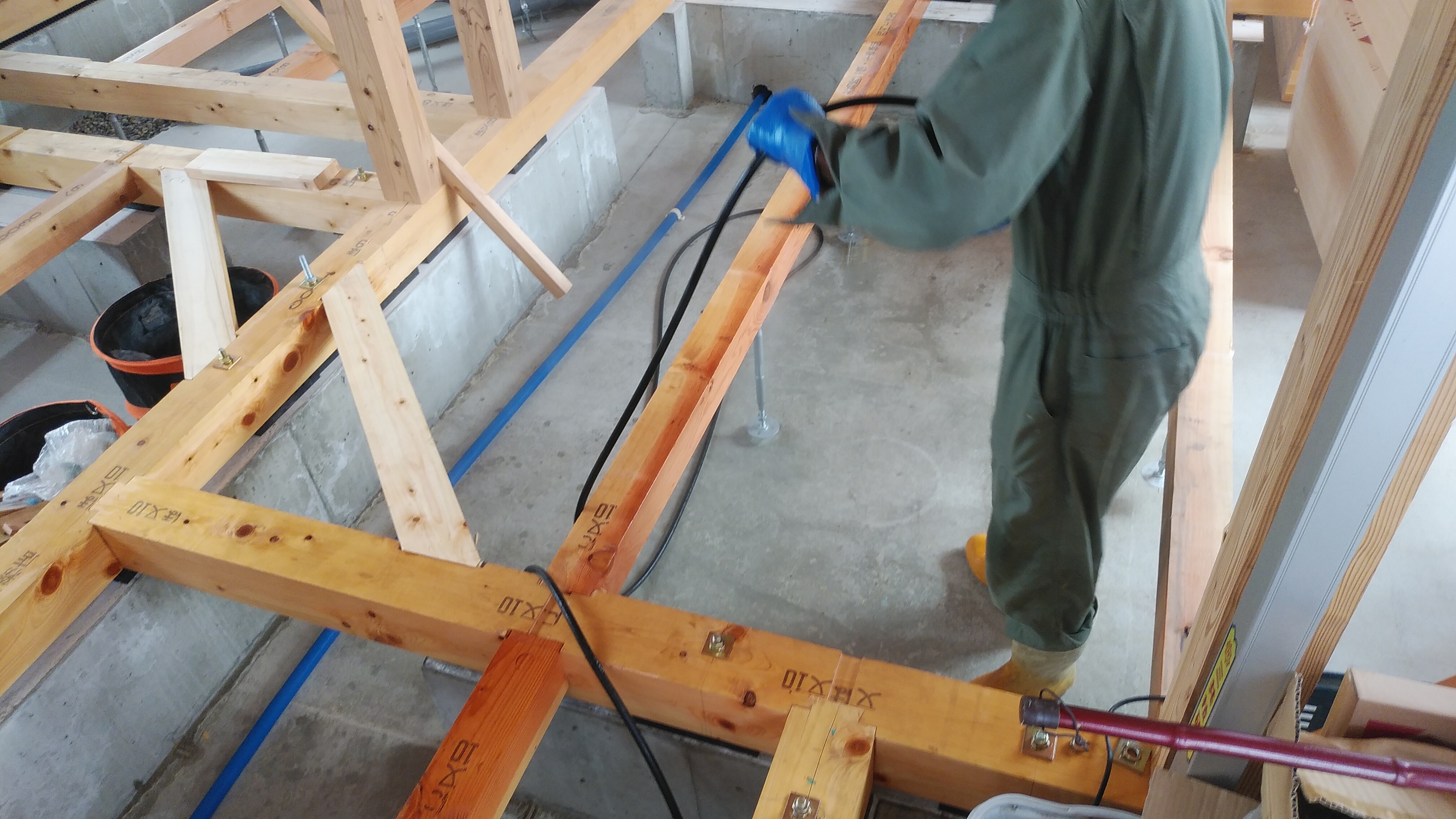 本日、防蟻工事を行いました。 これで白蟻からの攻撃はなくなります。 明日は床の下地を行う予定です。