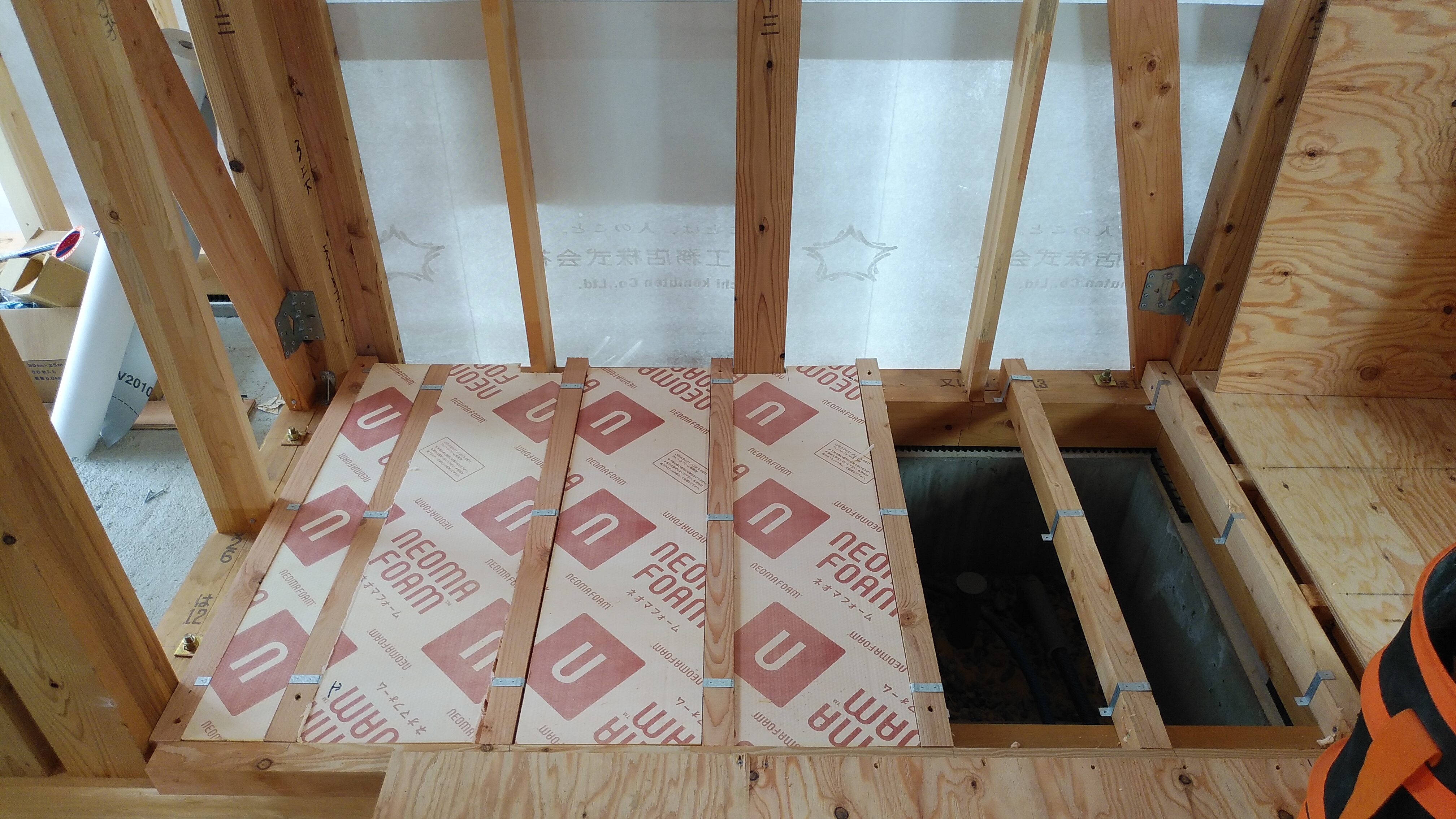 床の断熱材が施工されました。 暑さ寒さから守ってくれます。 壁の断熱材は明日施工予定です。