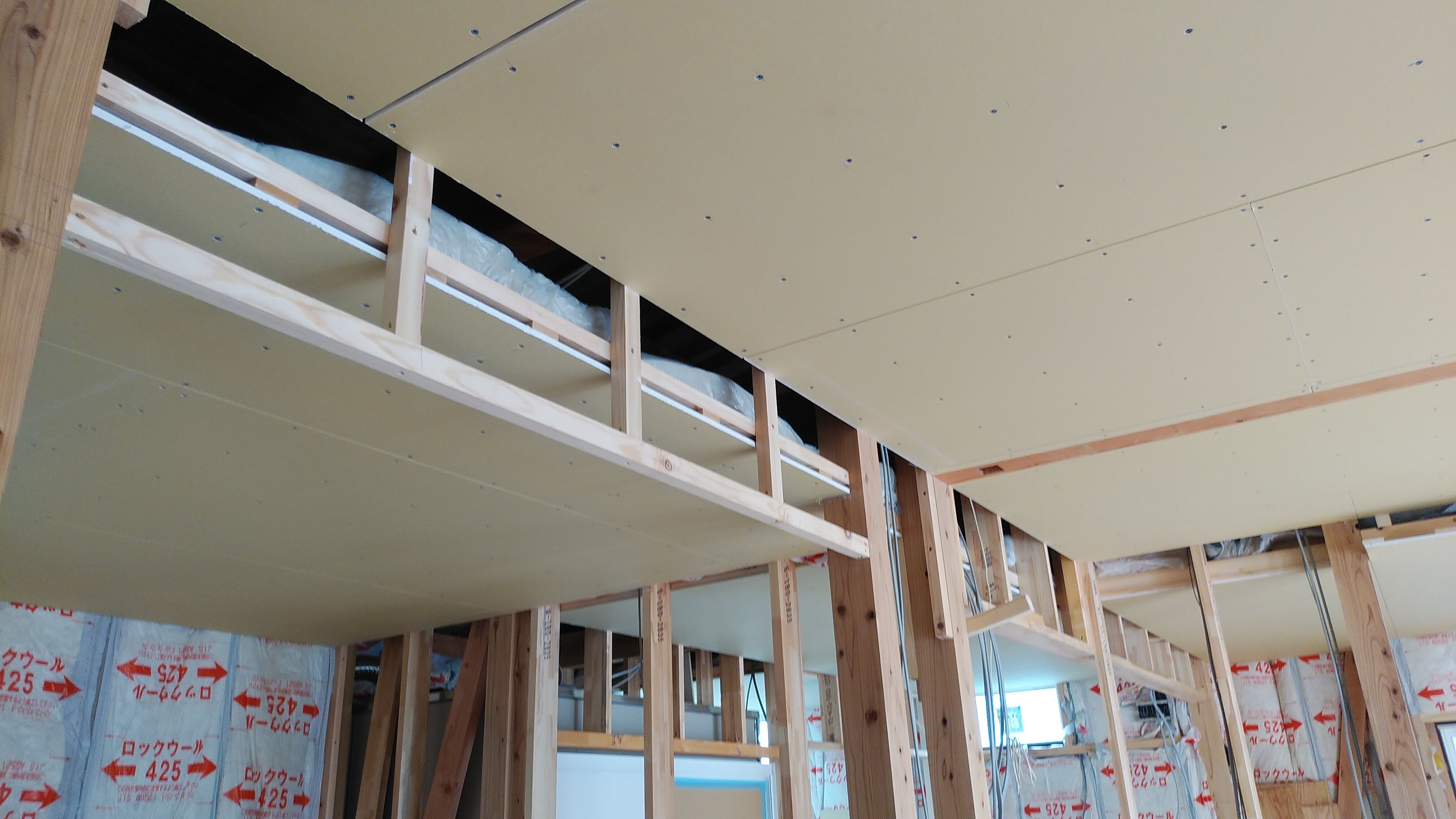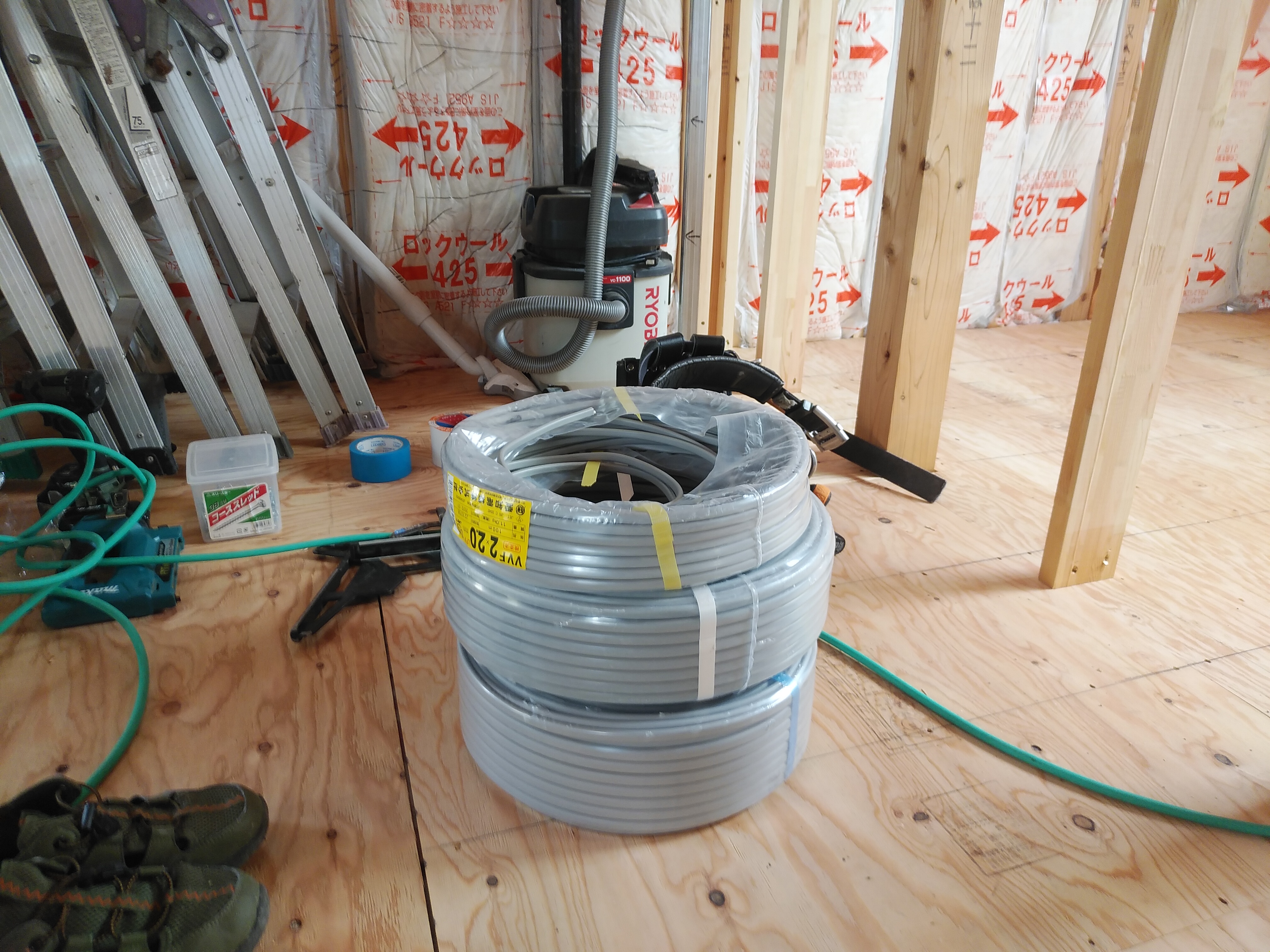 今日から電気工事が始まります。 室内のコンセント、スイッチ類に使われる配線を図面を見ながら整備していきます。脚立に上がったり、降りたりする大変なお仕事のため、職人さんに感謝です!