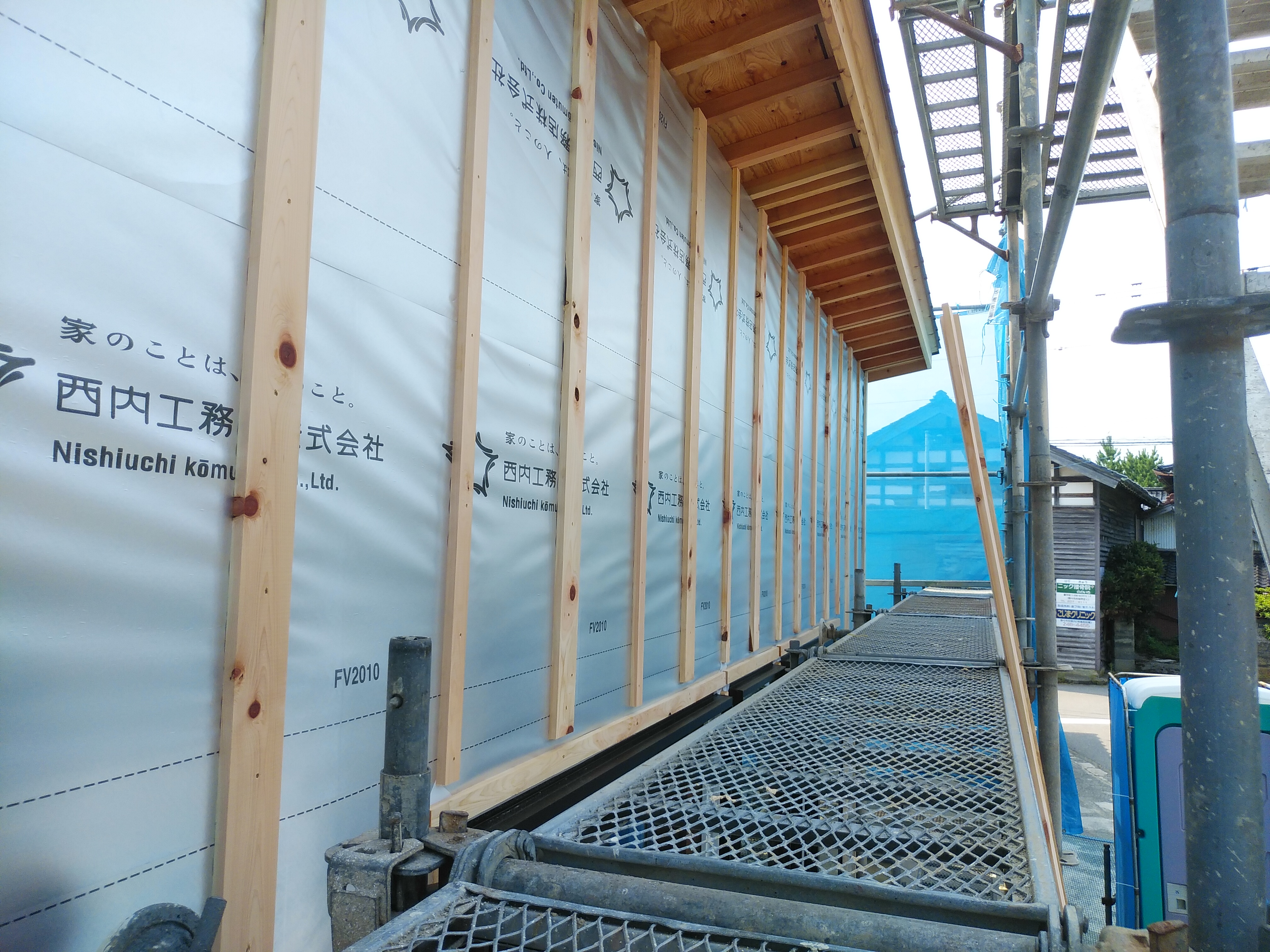 建物外部も着々と工事が進んでおります。 吹付用の外壁を貼るための木下地の施工が完了していました。