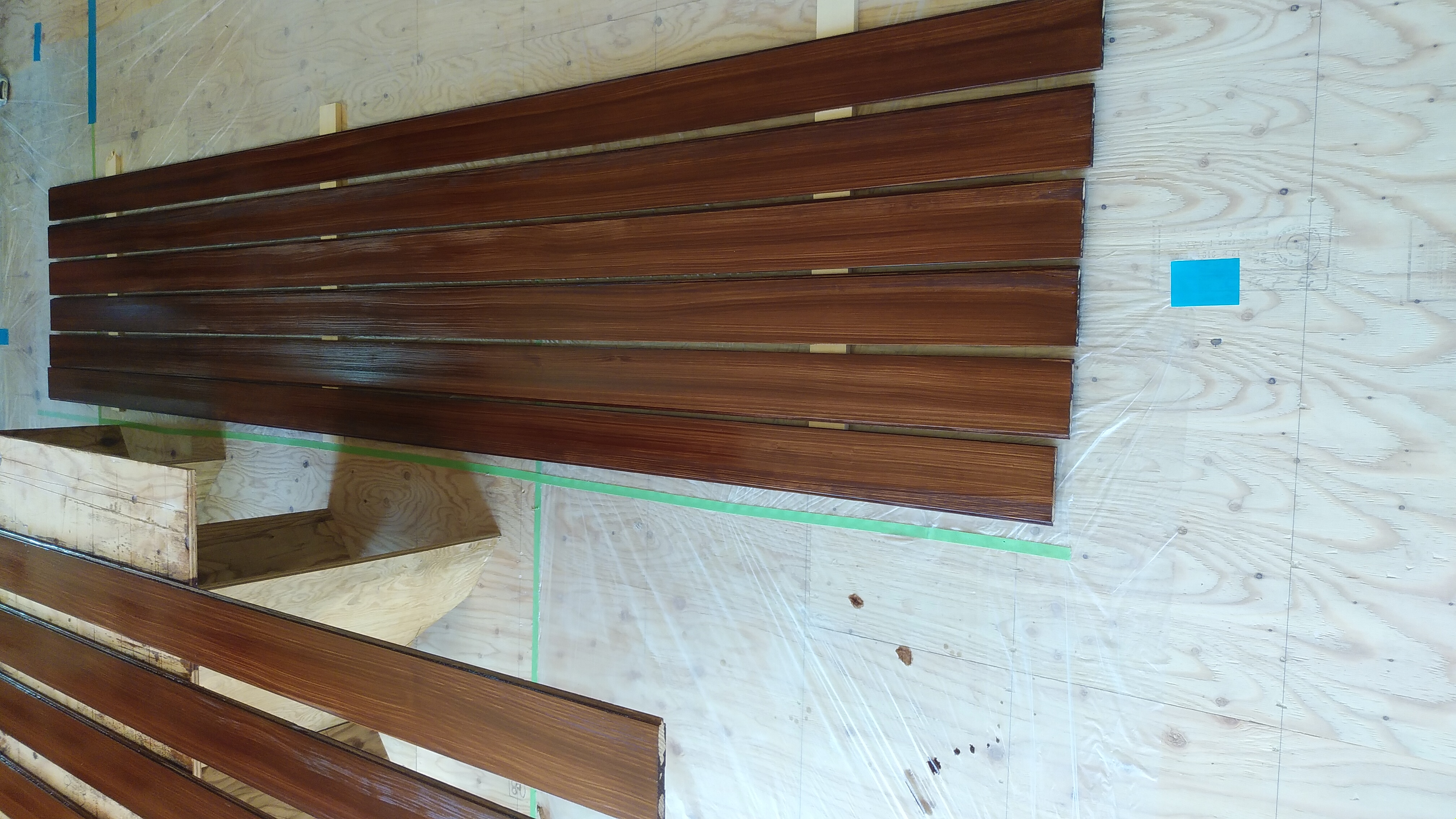 塗装工事がスタートしました。 場所に応じて着色、クリア塗装で納めていきます。