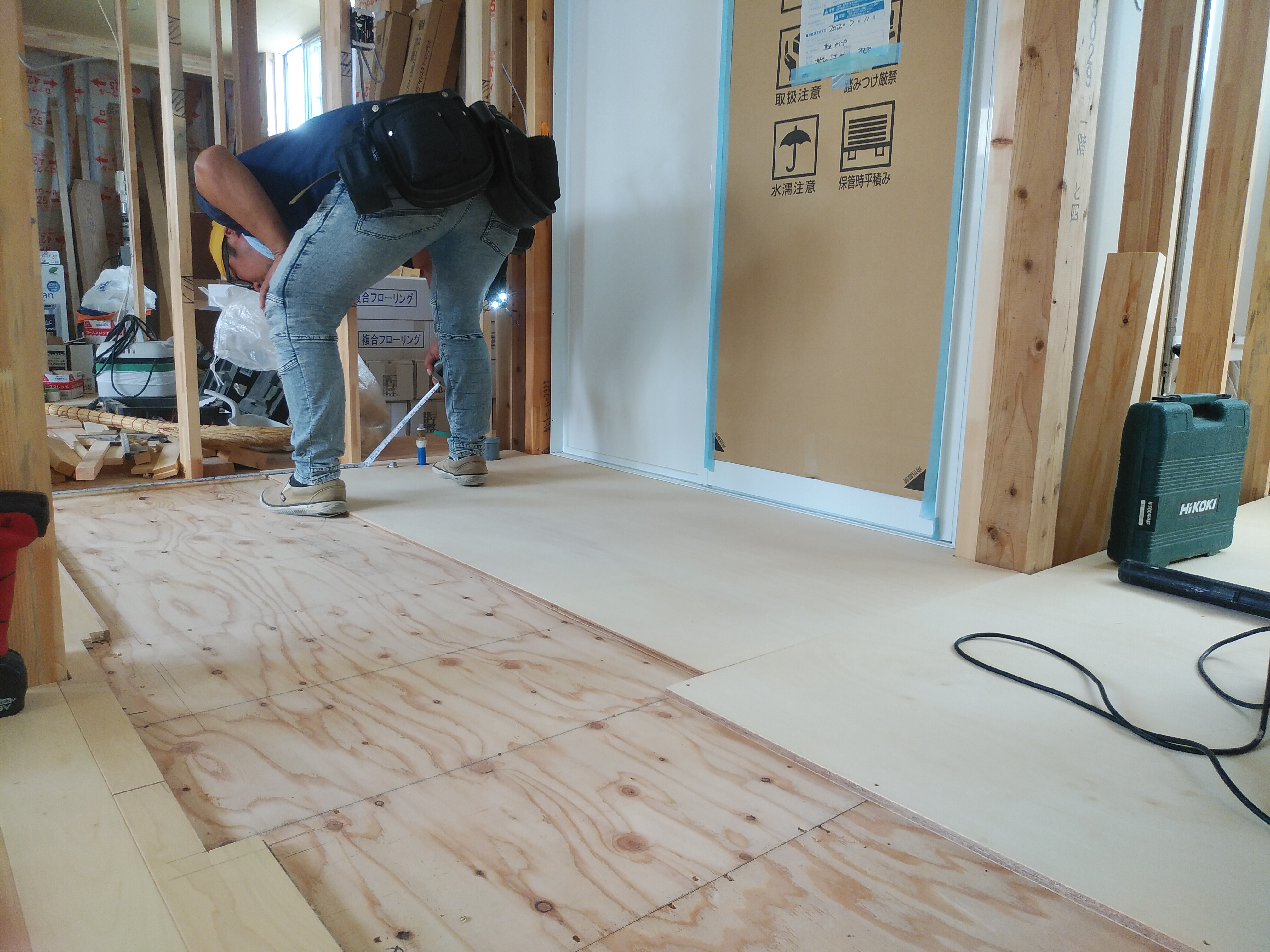 現在LDKではフロアー材の取付を行っておりますが、脱衣室、サンルームなどはフロアータイル敷きとなるため、構造用合板の上にベニヤ貼りを行っています。給水・給湯の配管口を確保しながら丁寧に敷設していきます。