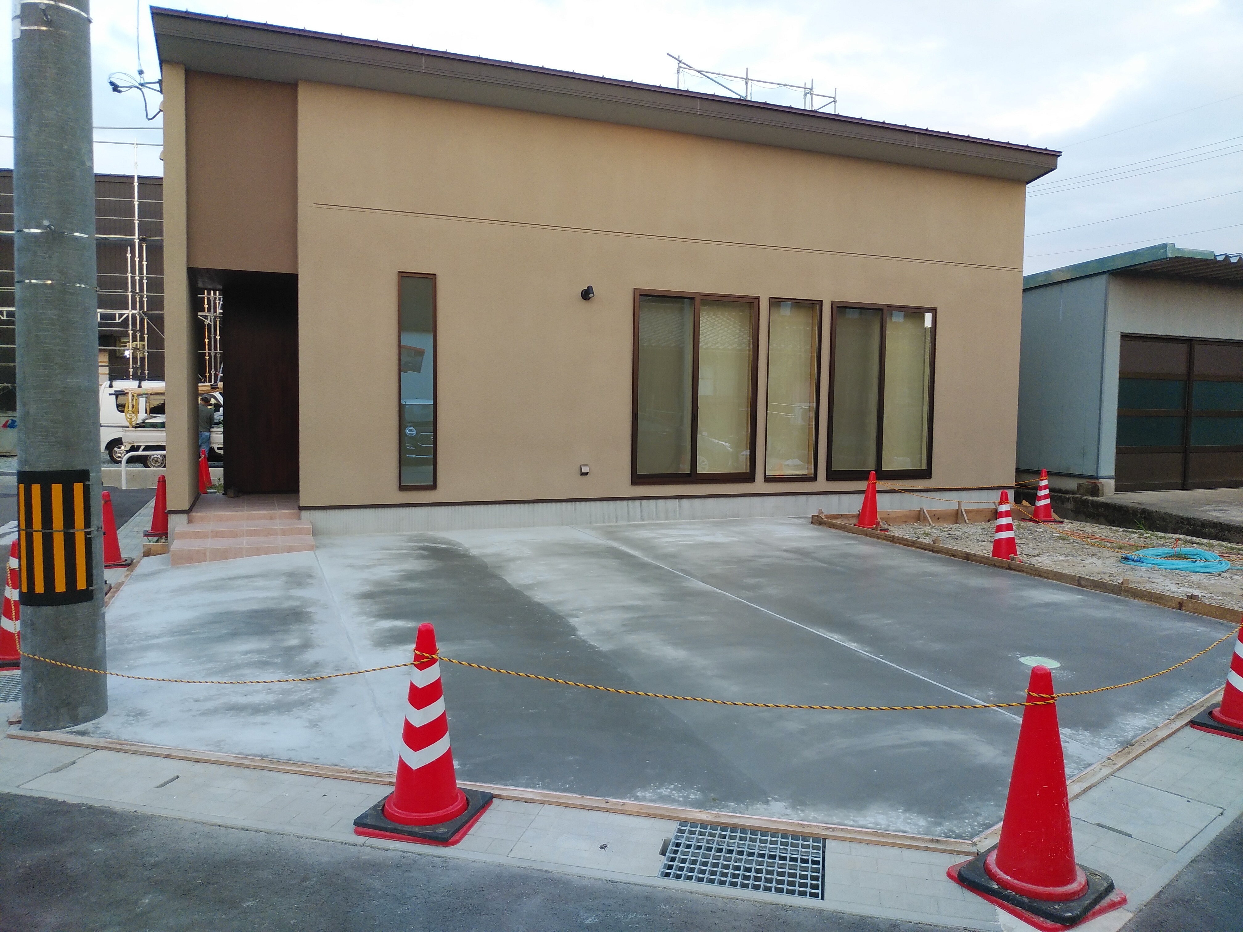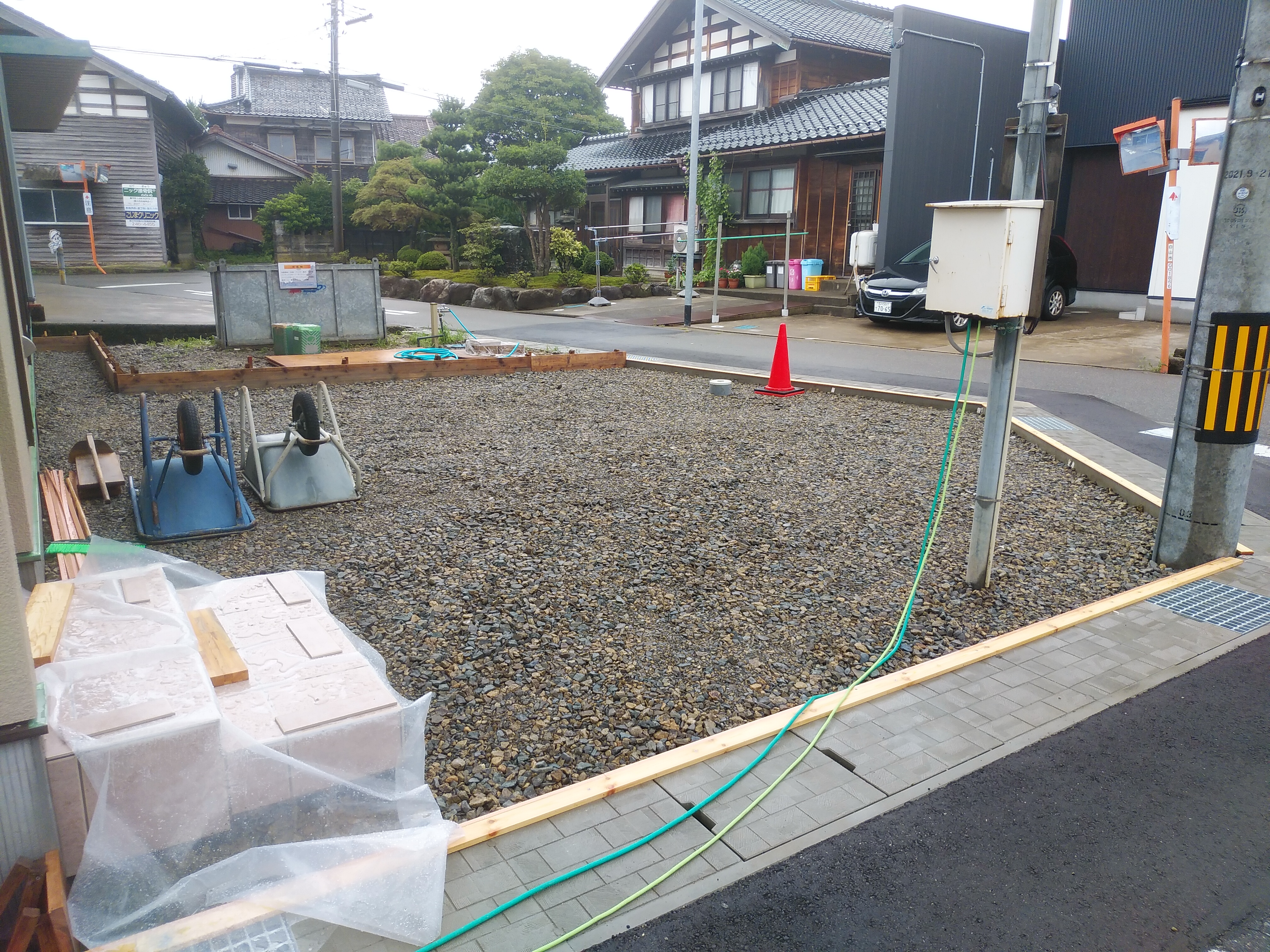 駐車場の土間打設が終わり現在養生中の状況です。 今週末はいよいよ内見会となります。お天気が少し怪しいですが、たくさんの方々の来場を予定しており、賑やかになりそうです。
