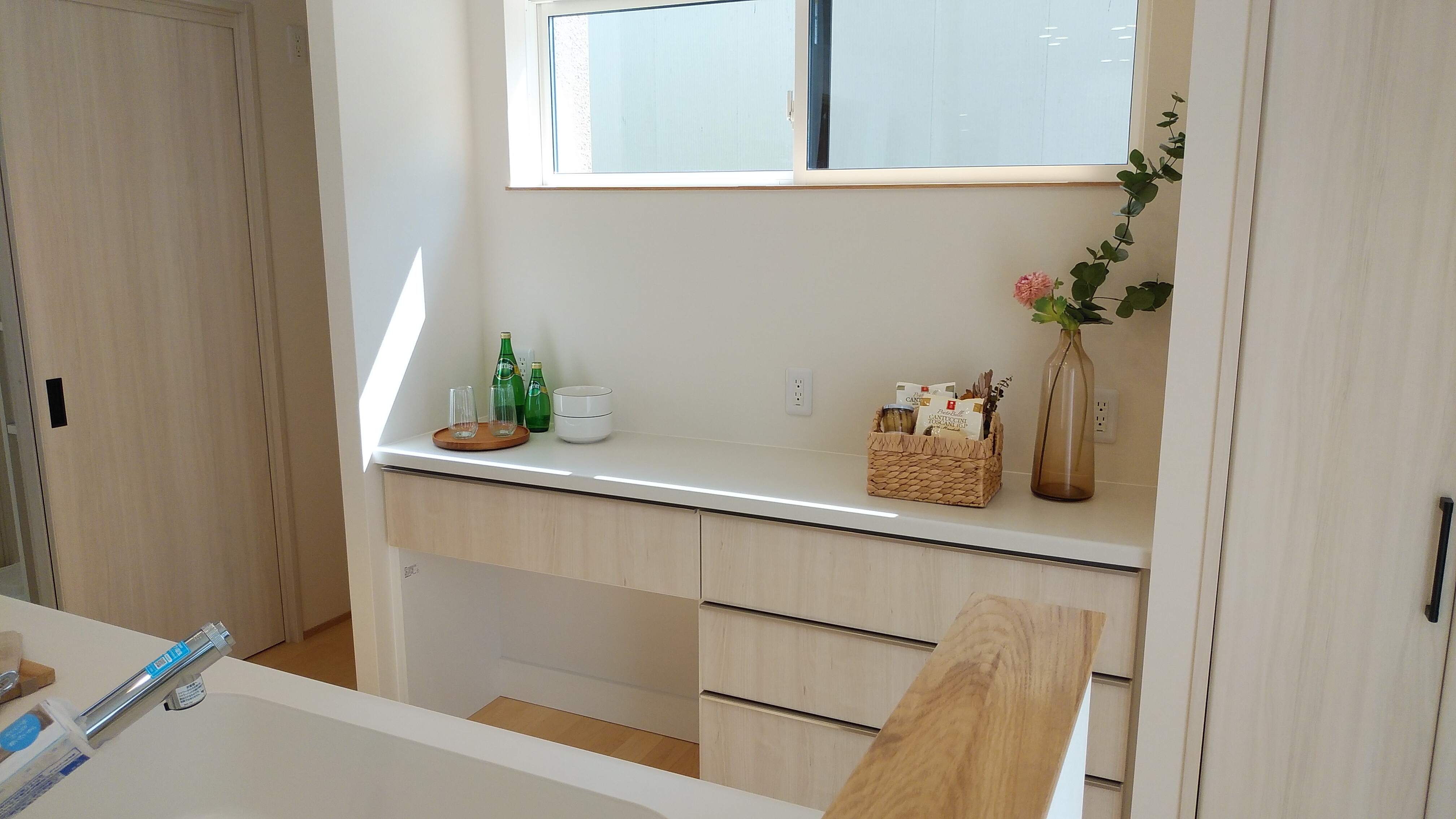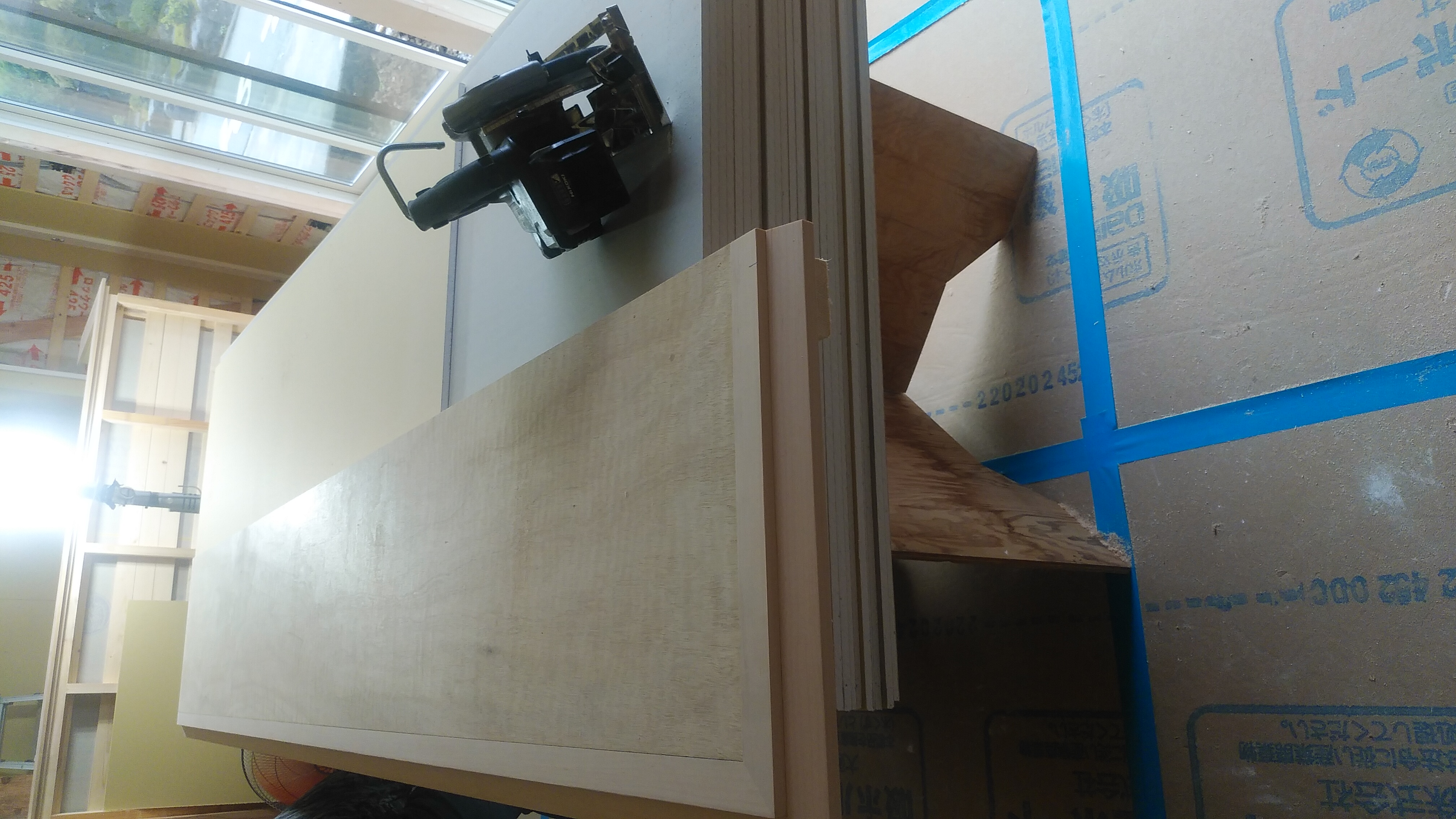 シューズボックスの天板取付の準備をしております。 下地が干渉する部分を加工して取り付けられます。