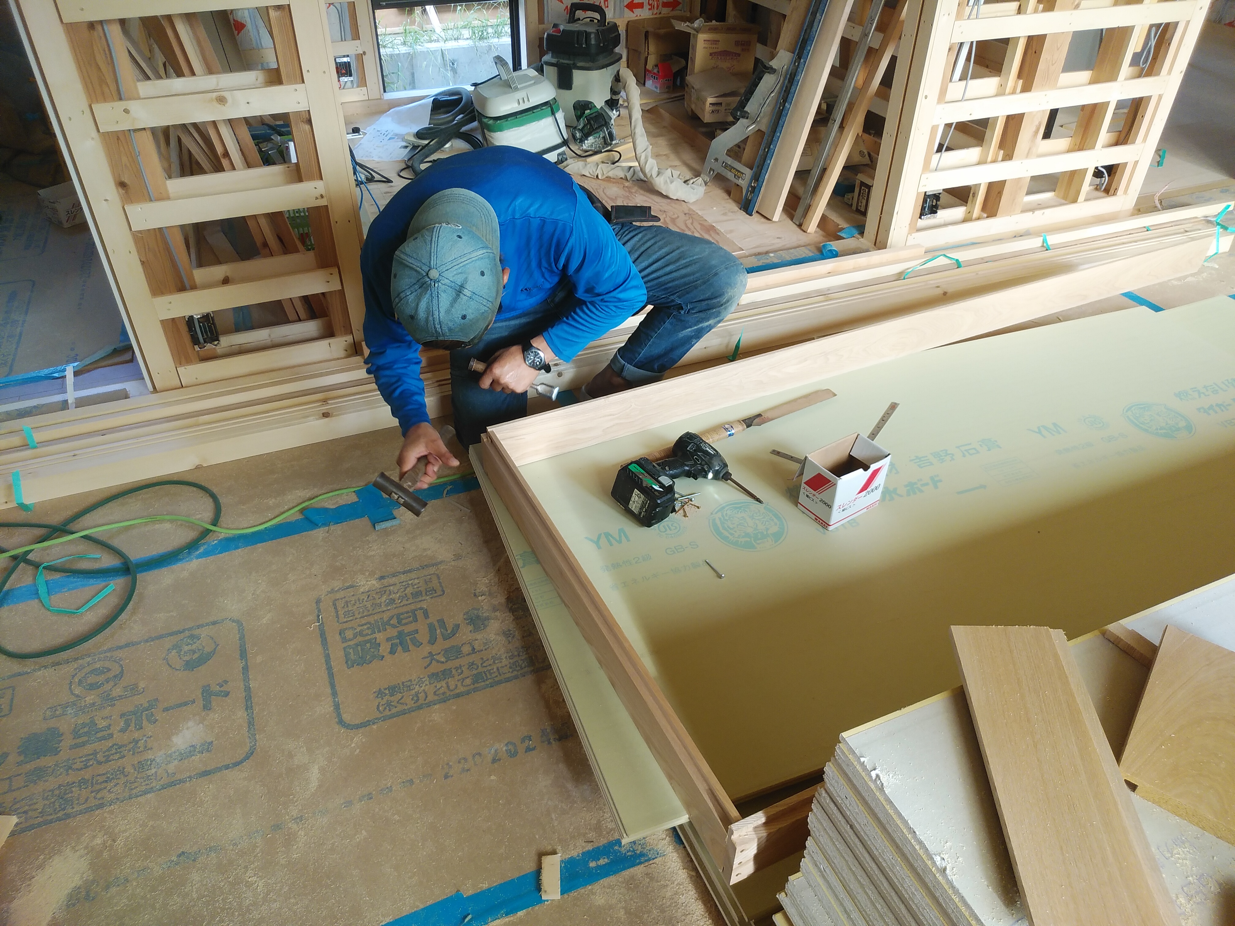 昨日、大工さんが玄関造作枠の組立を行っておりました。 お客様を招き入れる大切な玄関ですので、慎重に作業を進められていました。