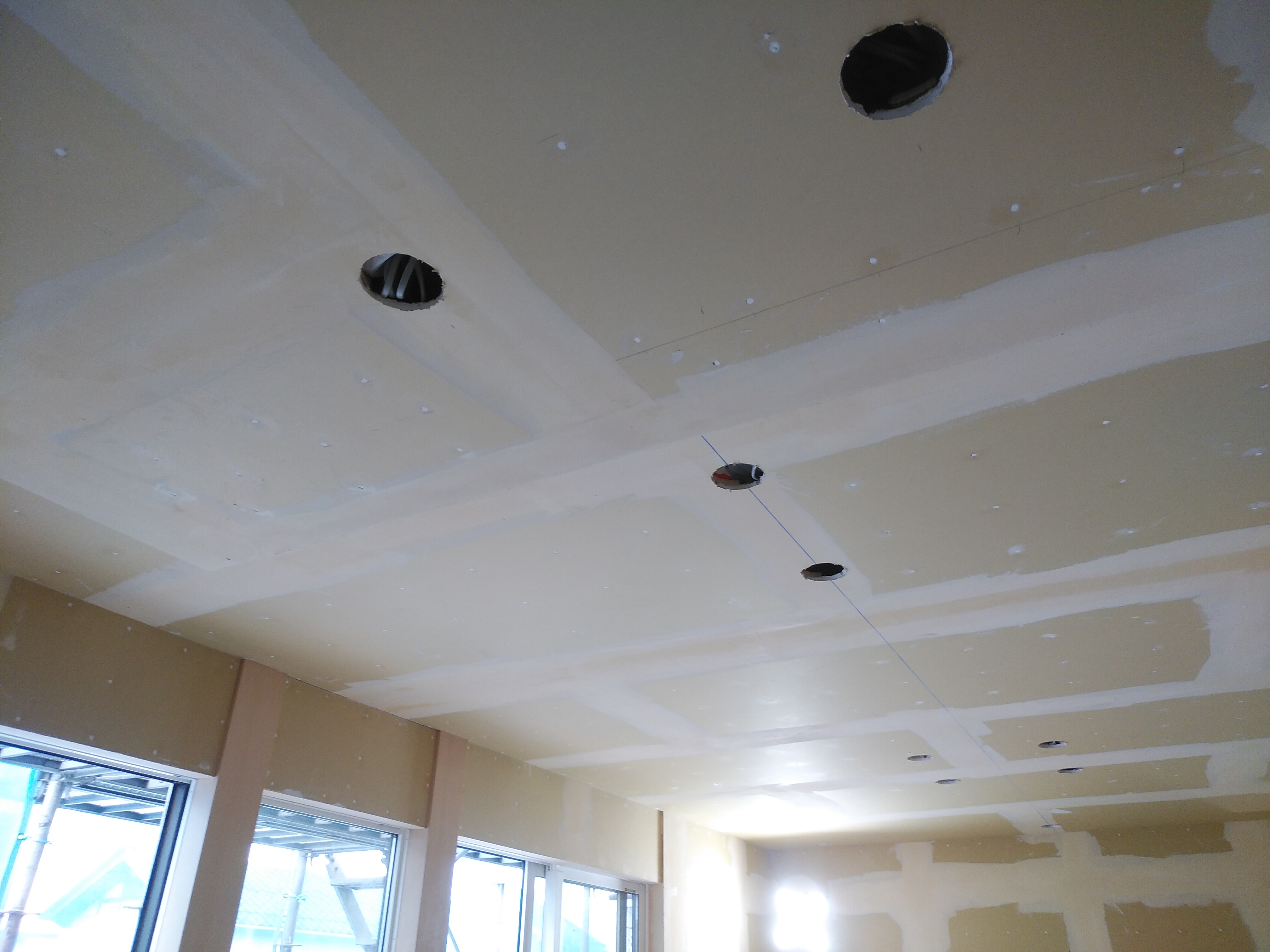 クロス貼りの前に、照明やコンセントスイッチを付ける部分のボードを開口しております。 クロスを貼ってしまうと見えなくなるためです。