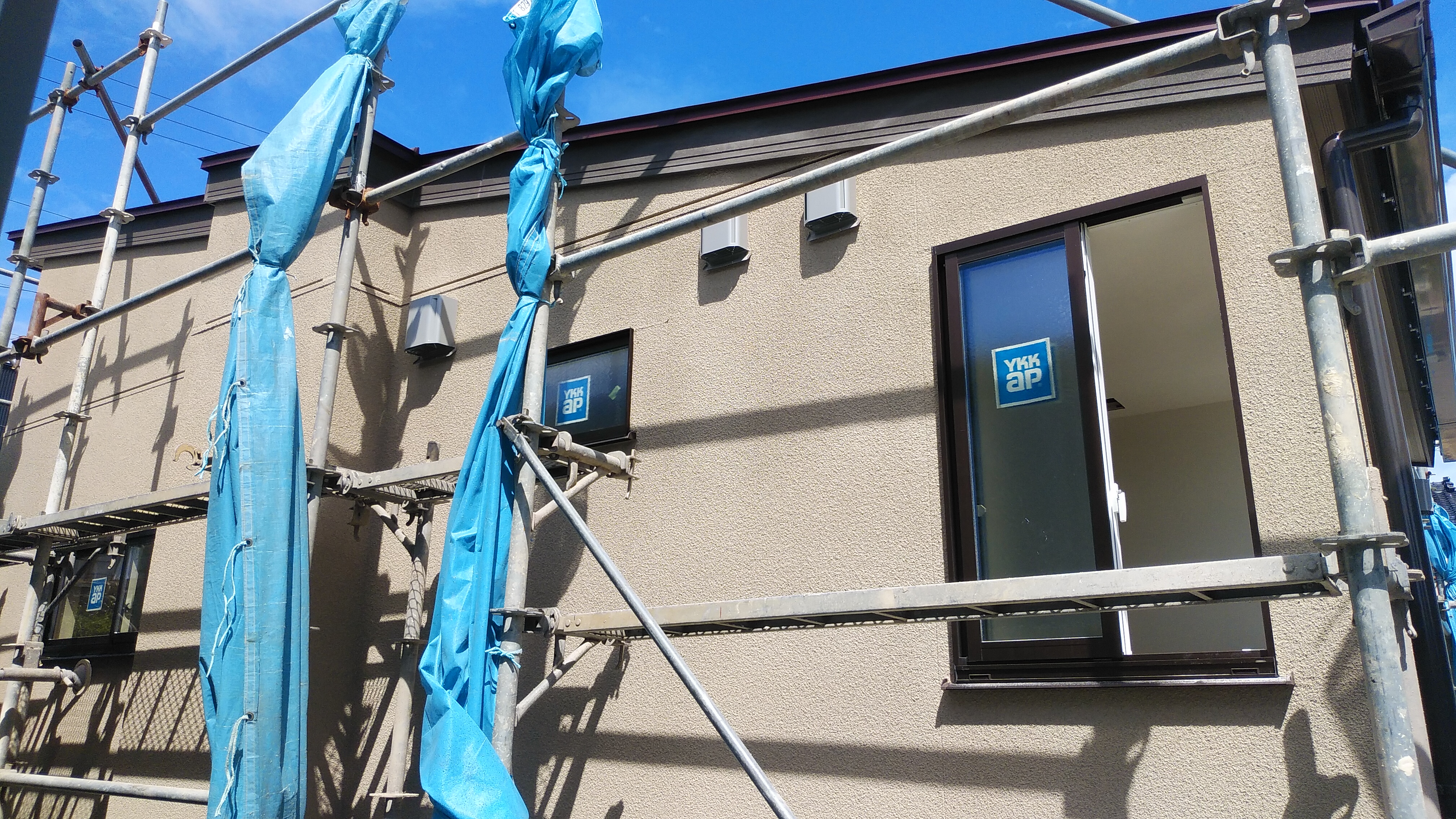 外壁サイディングの貼付施工が始まっています。 重い材料を寸法通りにカットして、所定の場所に搬入、貼り付けとなります。 暑い中での大変な作業・・・ 職人様に感謝です!
