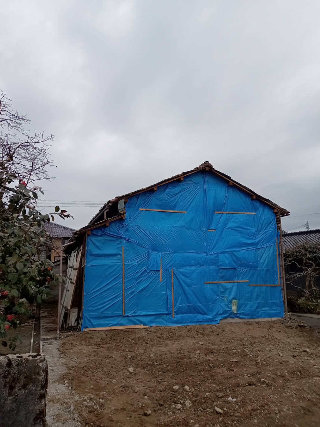 こんばんは。 今週、納屋の解体工事が完了しました。 ご所有品の移動など、解体工事に際して、ご協力くださり、 誠にありがとうございます。 解体工事後は、母屋と解体させていただいた納屋の接合していた面の修繕工事をすすめてまいります。