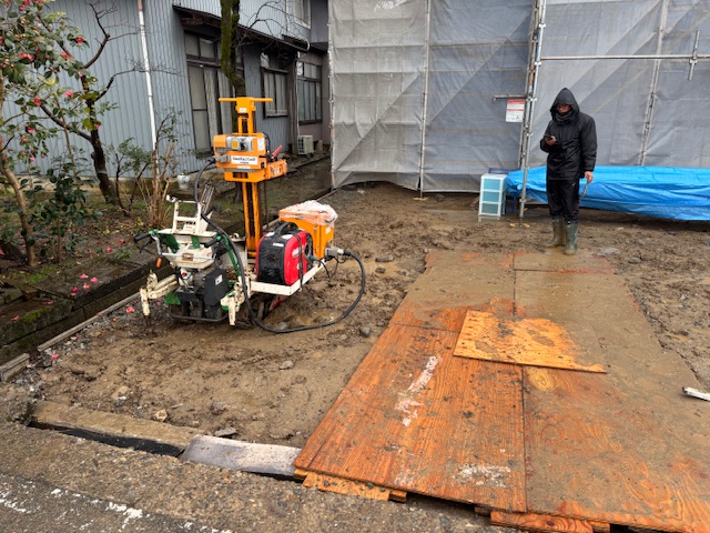 本日地盤調査を実施しております。 建物の建設に際して、地盤の固さをお調べする大切な調査になります。 調査結果が判明しましたら、改めてご報告させていただきます。