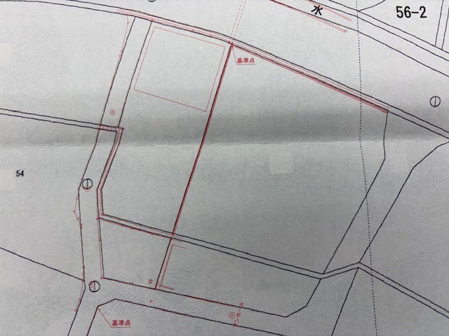 建物を建築する際には、民地(隣りの方)や官地(道路や水路など)との境界の合意がとても重要になってきます。そのために土地家屋調査士に正確な位置関係を測量していただいております。画像は敷地確定の際に使用した測量図の一部となります。 土地は所有者様の大切な財産となりますので、有資格者による正確な測量のもと決定していきます。