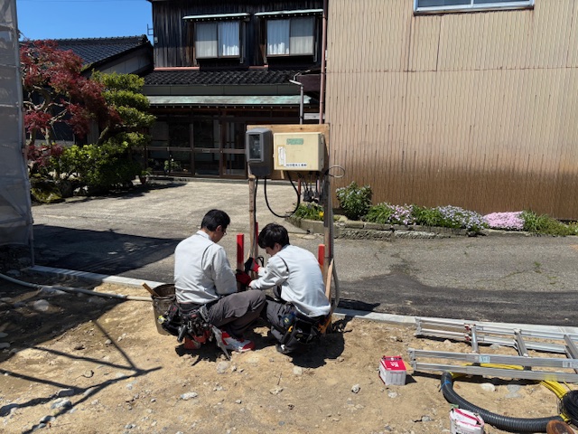 本日仮設電気の引き込み工事を行っております。 多くの職人さんが作業する上で必要なインフラ整備となります。