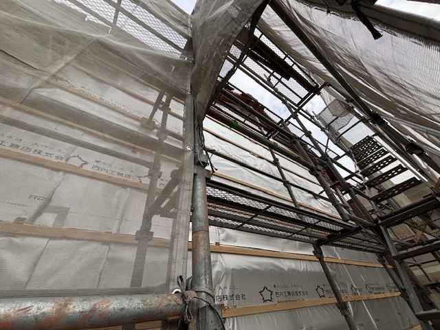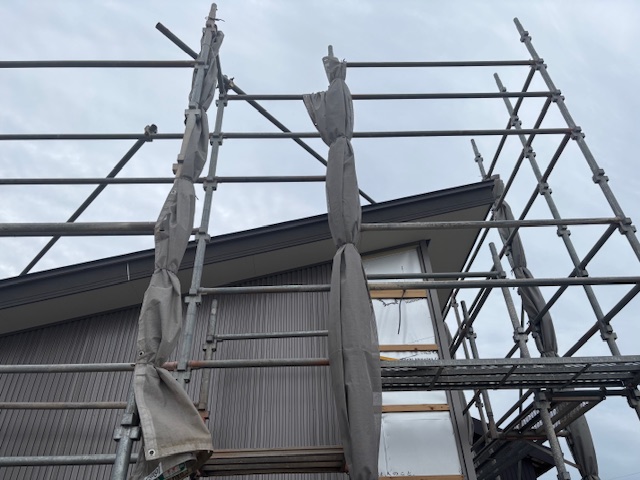 建物の解体後、棟続きだった母屋の外壁のつづくり工事に向けて、足場を設置いたしました。
