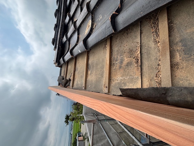 母屋屋根工事にあたって、見栄えがよくなるよう破風板を瓦よりも前に出すために、雨どいの長さを調整させていただき、施工しています。 雨どいは板金工事の際に、端部を再度調整します。