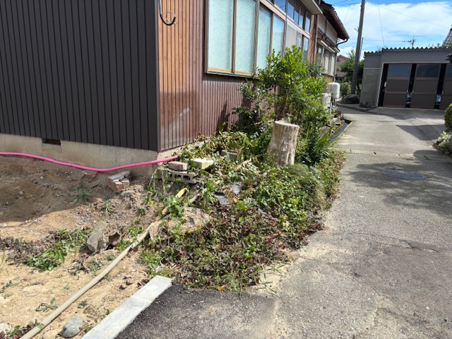 ご実家のつづくり工事と並行して新築部分の配管廻りの工事にも着手します。画像の部分のご実家建物横のスペースに配管を設けるため、既存の植栽を撤去させていただきます。