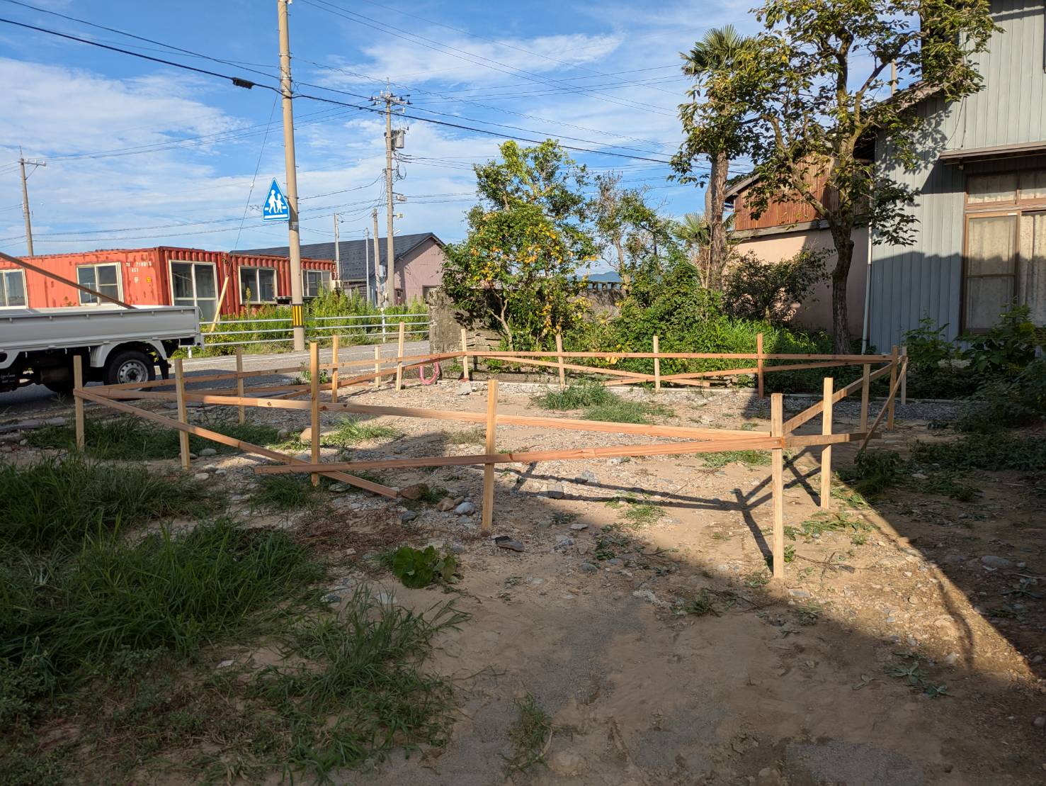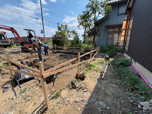 基礎工事をはじめるにあたって、丁張という仮設工事をさせていただきました。 丁張を目印として、基礎の位置や高さが決まります。建物の位置が確定する大切な工程なので、現地にて高さや寸法を正確に測ることができる道具を使用し、図面と照らし合わせながら作業を進めました。 これから基礎工事が始まります。安全第一で工事を進めてまいります。引き続きよろしくお願いいたします。
