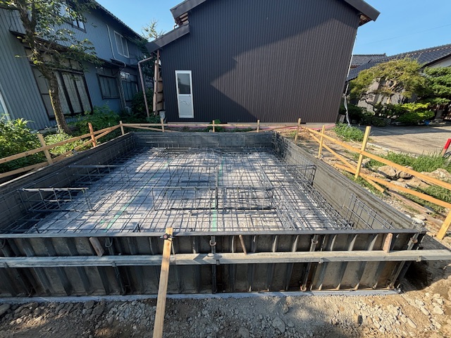 基礎工事が始まりベース部分の配筋が完了しました。週明けに検査機関の検査を受け、合格後にベースコンクリートの打設を行います。