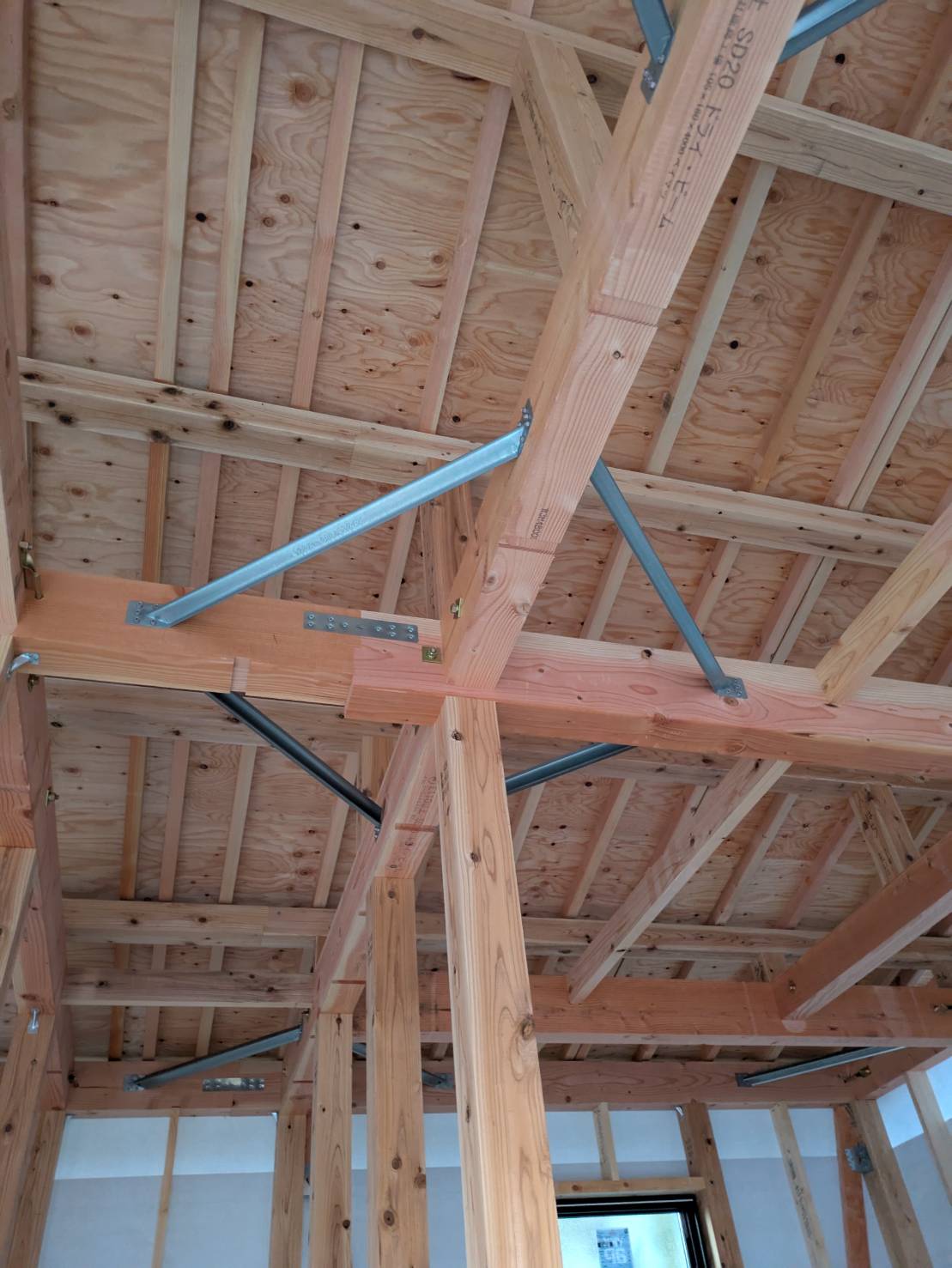 建て方翌日から、サッシ取付と金物取付を進めています。 金物取付完了後、外部機関による、躯体検査をおこない、金物が適切に施工されているかのチェックをおこないます。 十分な強度を保った住まいを施工させていただくための、大切な工程です。