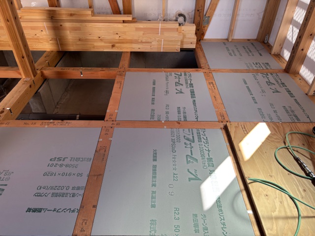 こちらは床の断熱材を敷設している様子です。事前にカットされた断熱材を所定の場所にはめ込んでいます。