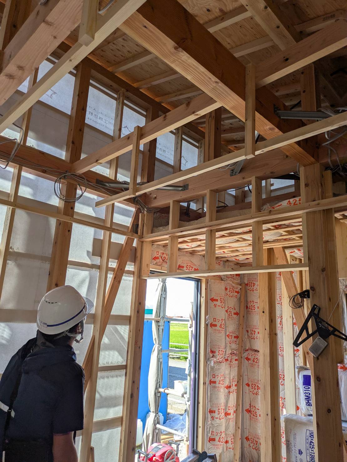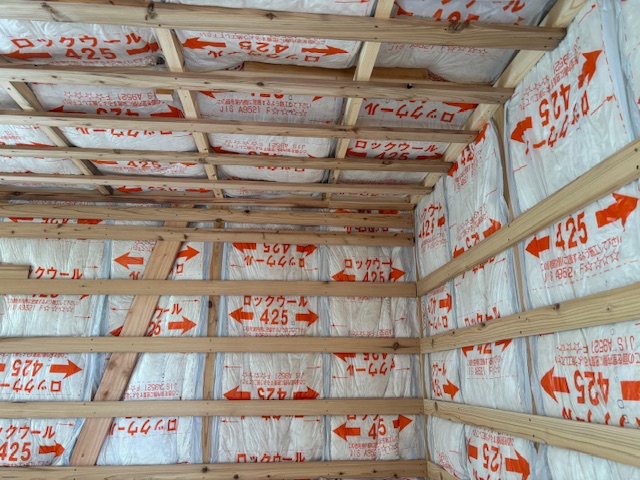 大工さんの工事が順調に進んでいます。室内の断熱材もしっかりと取り付けされていました。