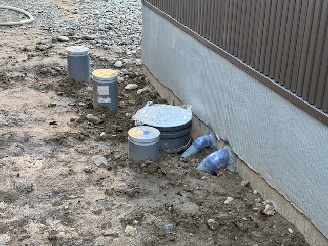 今後の立ち上がり部分の打設前に配管の取り付けが完了しています。